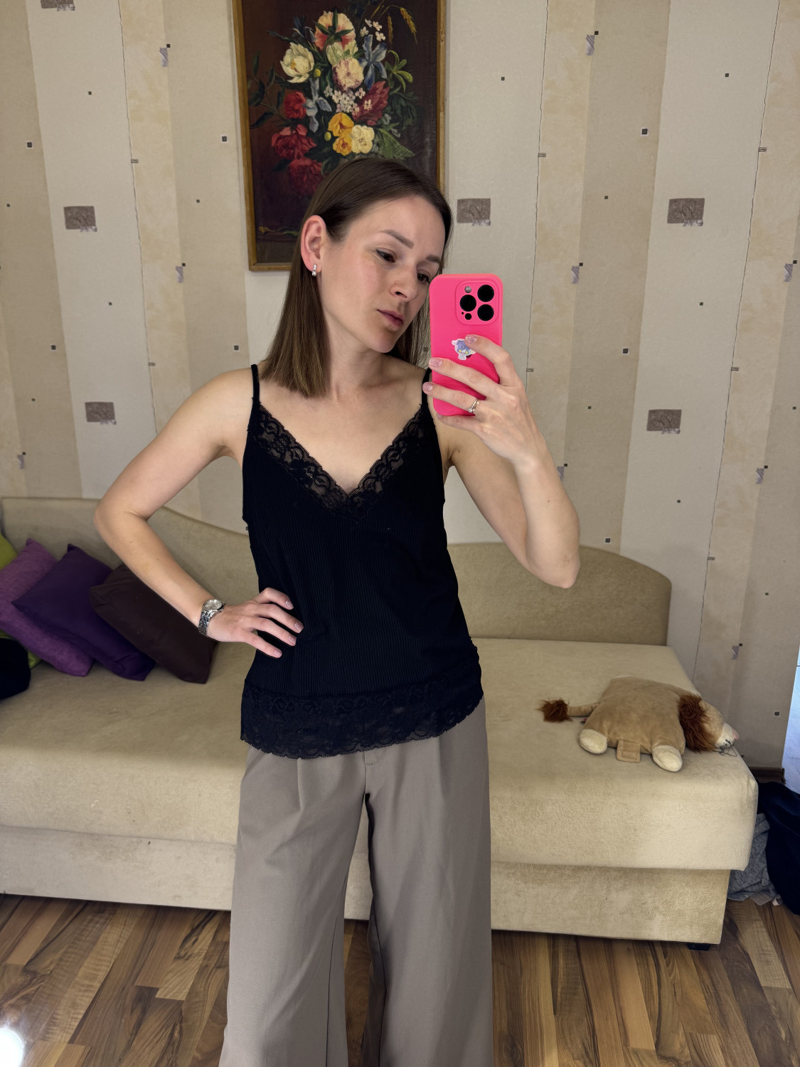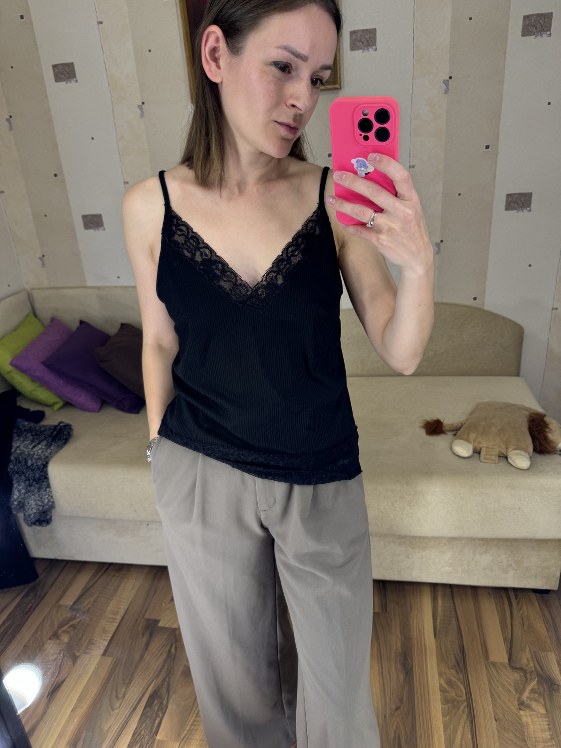 10Параметры модели: рост 170 см, обхват груди 88 см, обхват талии 63 см, обхват бедер 92 см. Выбрана выкройка 44 размера, рост 166-170 см. Корректировки не выполнялись.