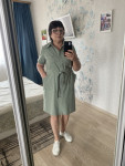 Женское платье-рубашка малого объёма, прилегающего силуэта. С нагрудными и талиевыми вытачками, нагрудными накладными карманами на полочках, с плечевыми и талиевыми вытачками на спинке. С втачными рукавами длиной до локтя, с отворотами по низу. С центральной застёжкой на планки, рубашечным воротником на стойке. Длиной - выше колена.