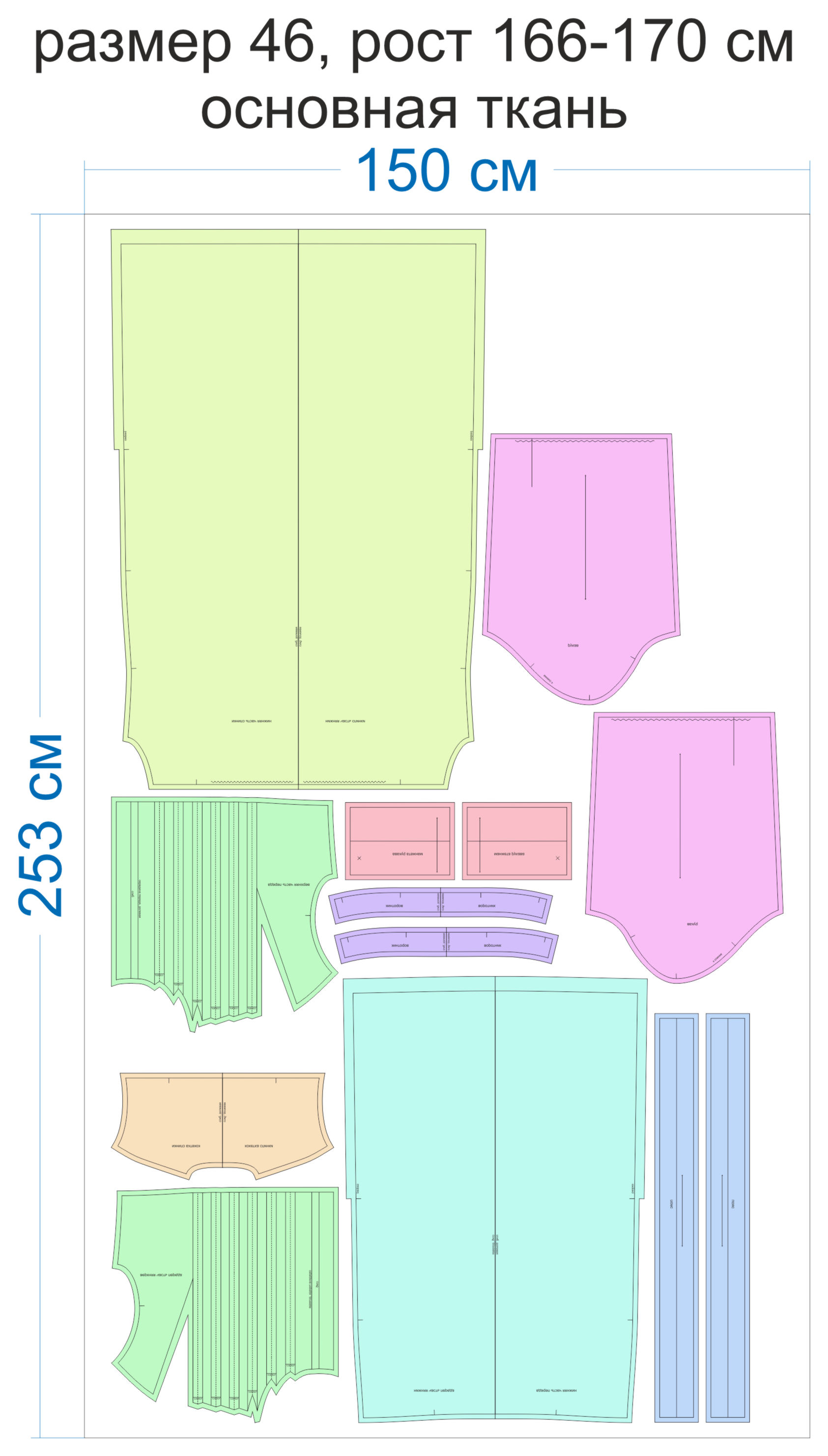 Внимание: расчет выполнен для однотонной ткани без рисунка, без учета направления ворса и возможной усадки! Усадка может достигать 15-20% от длины материала. Обязательно учитывайте это и берите с запасом.
