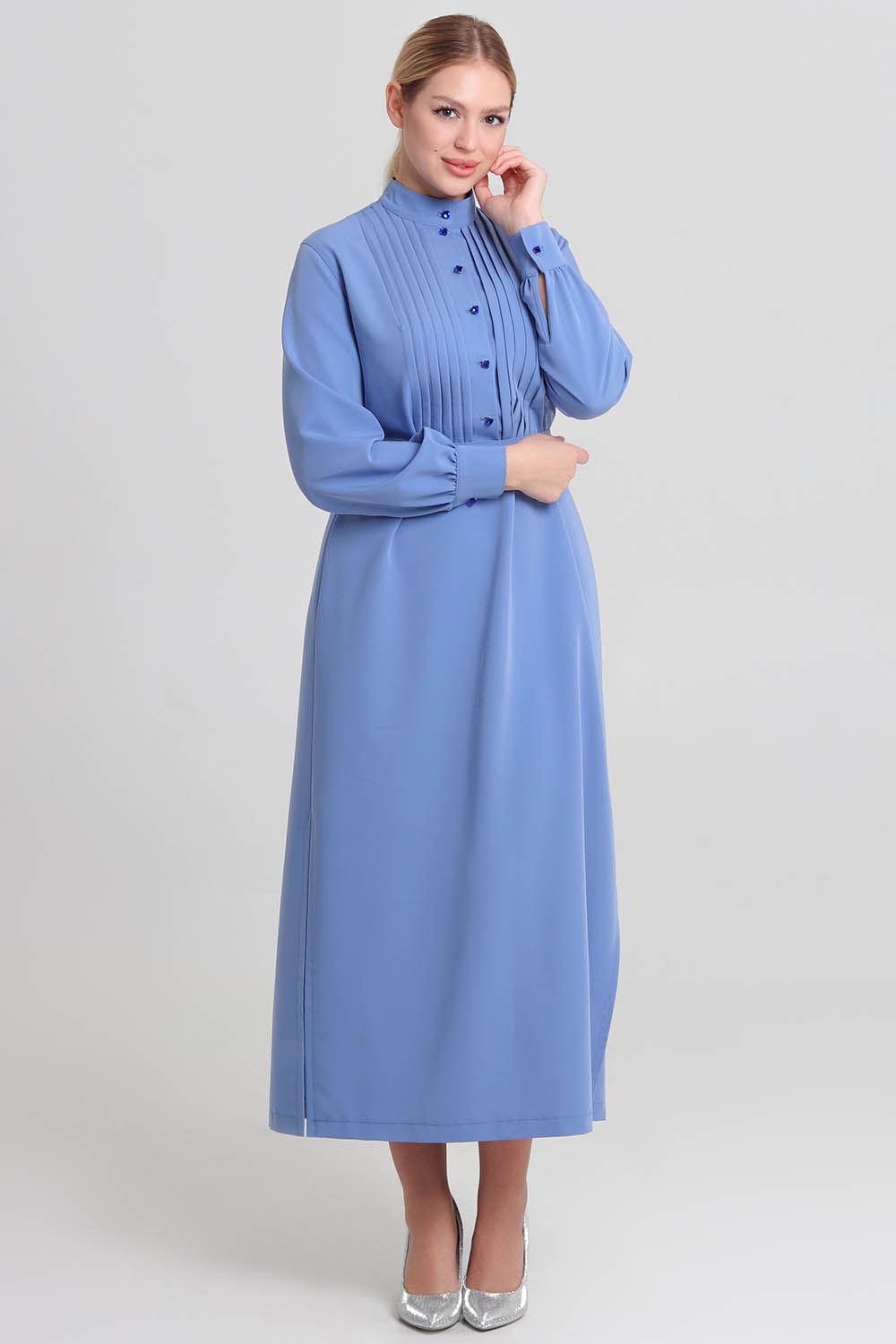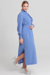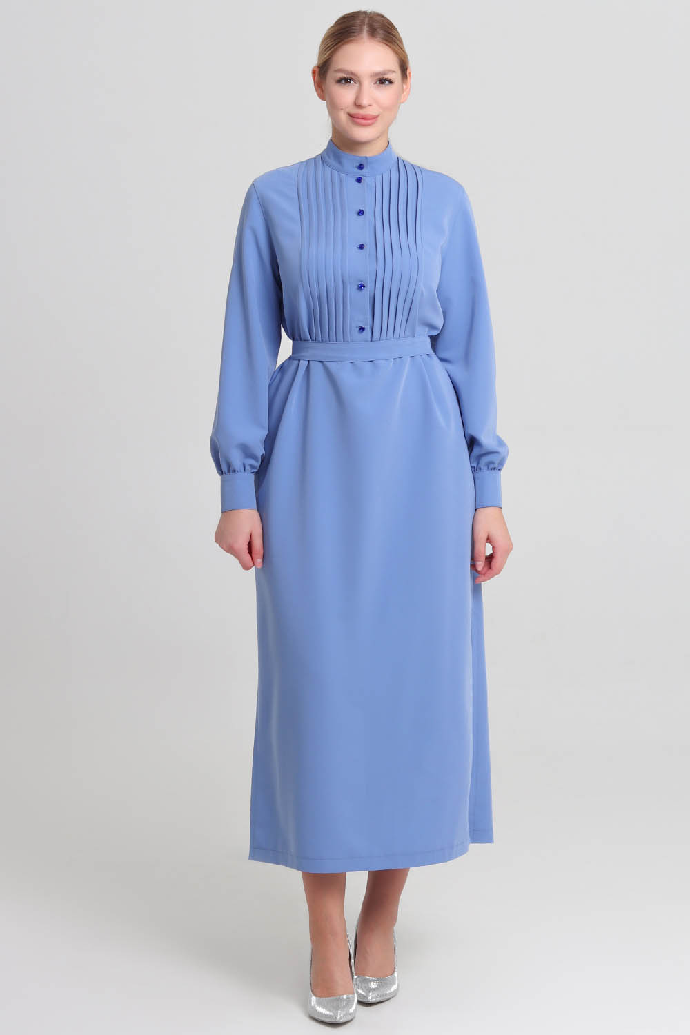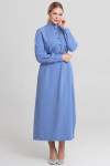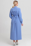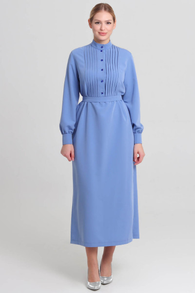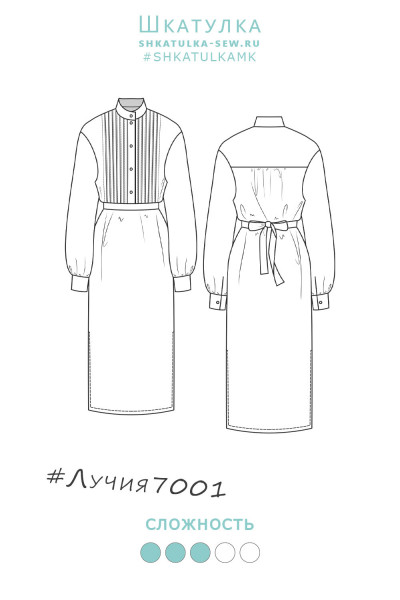 4Выкройка женского платья умеренного объёма, прямого силуэта, с немного спущенной линией плеча. Перед платья отрезной по линии талии. Верхняя часть переда - с нагрудными вытачками, выходящими из плечевого шва, с вертикальными складками, идущими также из плечевого шва, параллельно линии середины переда. Нижняя часть переда - цельная, без формообразующих конструктивных элементов. Спинка платья состоит из кокетки и основной части, присборенной по центру шва притачивания кокетки. Горловина платья оформлена воротником-стойкой. Застёжка - цельнокроеные планки на верхней части переда, обмётанные петли и пуговицы по воротнику и планкам. Рукава - рубашечного покроя, длинные, с разрезом и сборкой по низу, с притачными застёгивающимися манжетами. Длина платья - 7/8. По низу боковых швов изделия предусмотрены высокие боковые разрезы, обеспечивающие свободу движения.