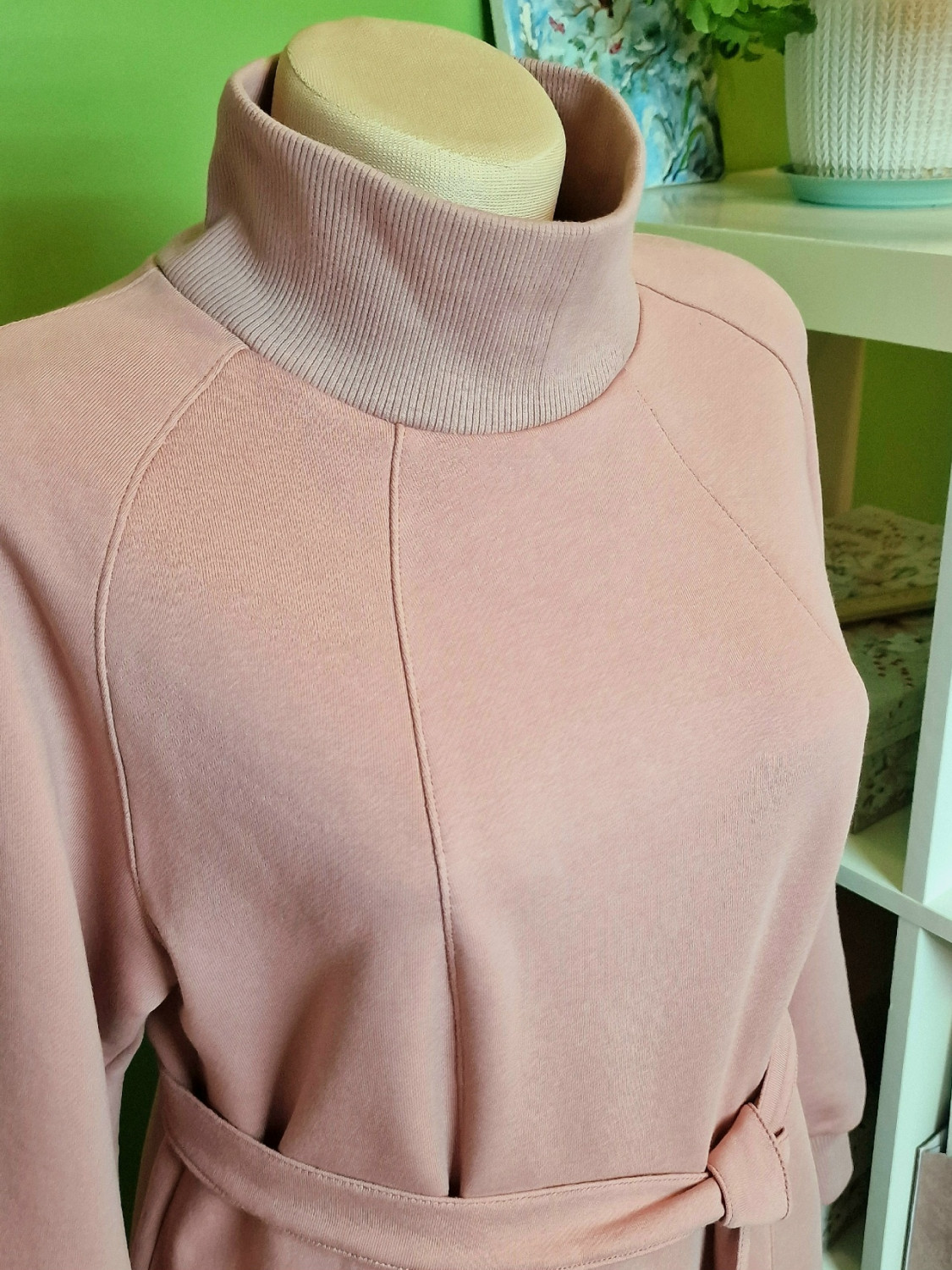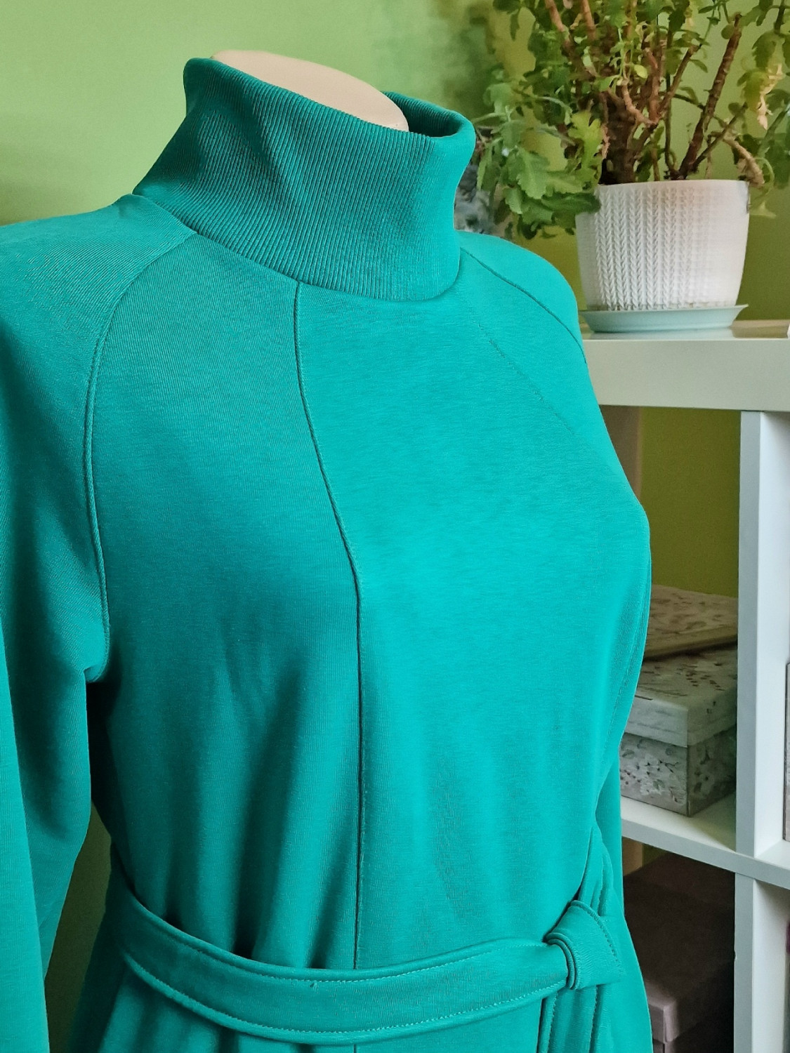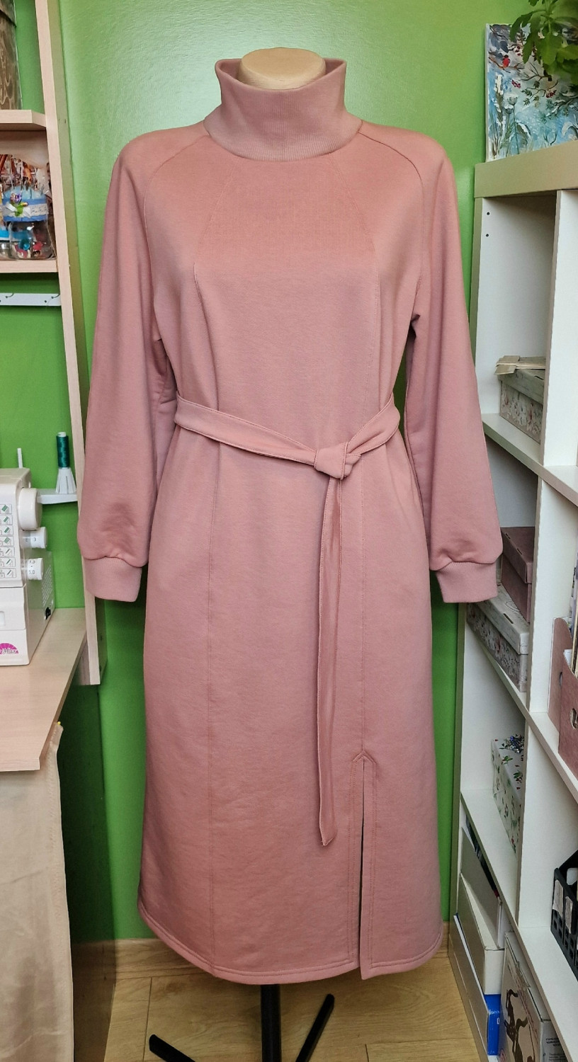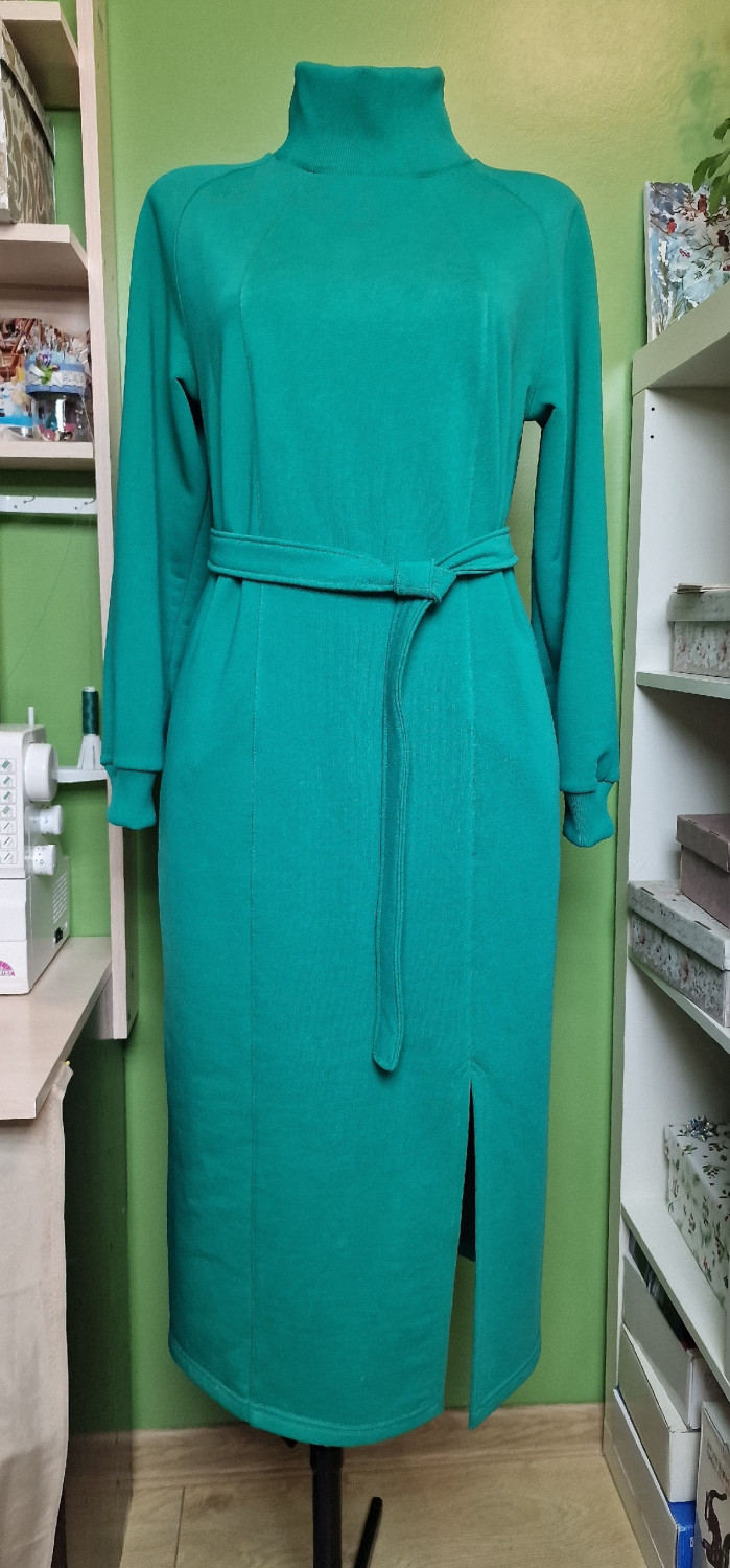 4Выкройка трикотажного платья-водолазки с рукавом реглан среднего объема длины миди. Спереди и сзади располагаются вертикальные рельефы, выходящие из горловины. В одном из рельефов переда оформлен разрез. Воротник стойка. Рукава длинные на притачной манжете. Без застежки. Платье дополнено навесным поясом.
