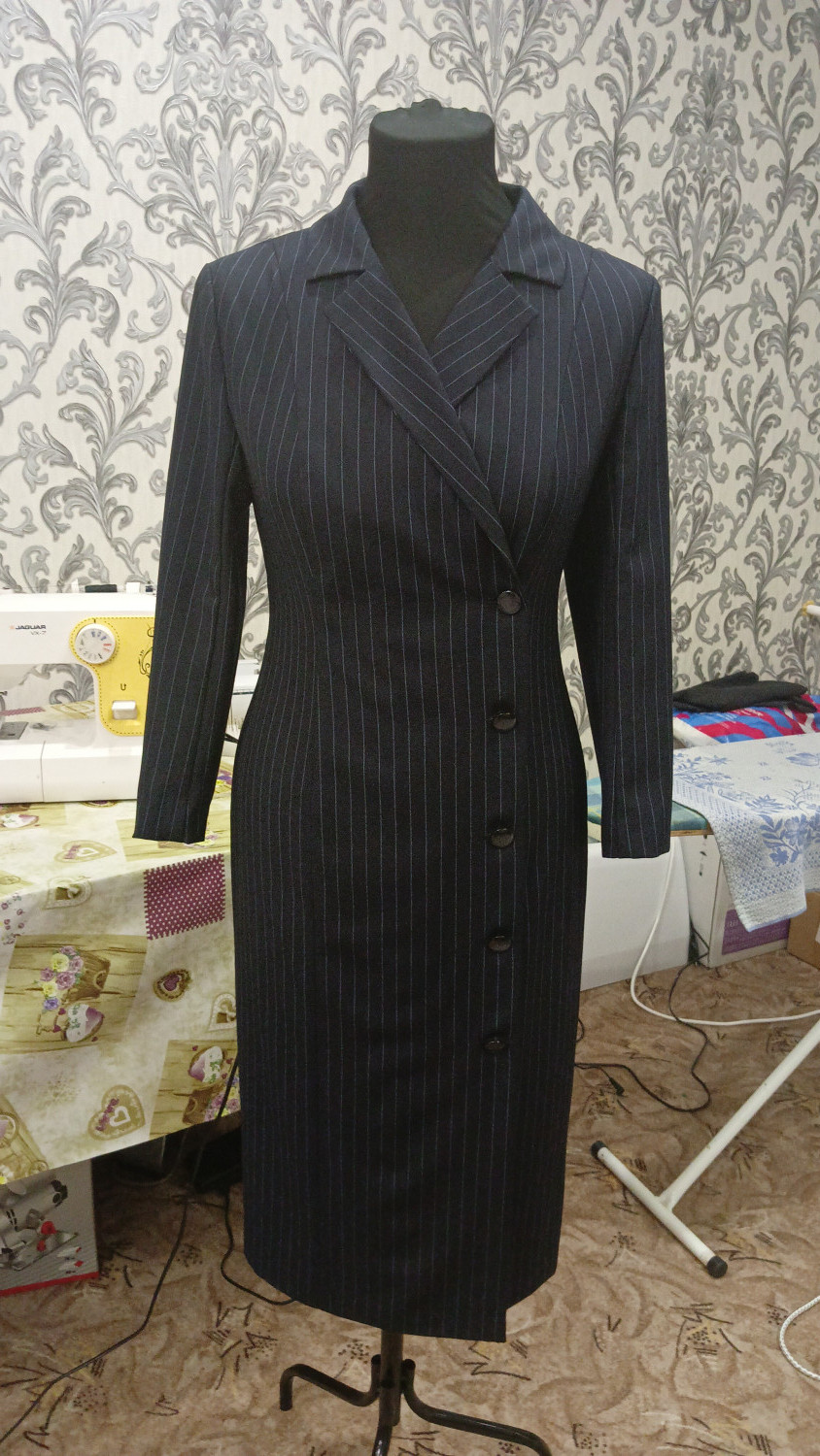 С вертикальными рельефами на полочке, средним швом и вертикальными рельефами на спинке. Со смещённой застёжкой и английским воротником. С длинными втачными двухшовными рукавами. Длина платья - ниже колена.