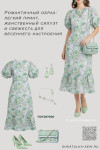 4Выкройка женского платья умеренного объёма, отрезного по линии талии, полуприлегающего силуэта. Нагрудные вытачки переведены в линию талии, за счет чего увеличена глубина талиевых вытачек. Верхняя часть спинки - с плечевыми и талиевыми вытачками, со средним швом.  На нижней части переда и спинки предусмотрены талиевые вытачки и широкий волан по низу.  Застёжка - потайная молния в среднем шве спинки. Горловина круглая, неглубокая, обработана подкройной обтачкой. Рукава объёмные фонарики длиной выше локтя, с расширением и сборкой по низу, на притачной манжете.  Длина платья — до середины голени.