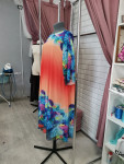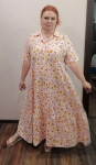 4Выкройка женского платья-рубашки в стиле "бохо", умеренного объёма, трапециевидного силуэта, со спущенной линией плеча. Перед и спинка - цельные, без формообразующих конструктивных особенностей, с переходящей с переда на спинку широкой оборкой по низу. Горловина платья оформлена рубашечным воротником с отрезной стойкой. Застёжка - центральная, на притачные планки, обмётанные петли на стойке и планке и пуговицы. Рукава - рубашечного покроя, среднего объёма, длиной выше локтя.