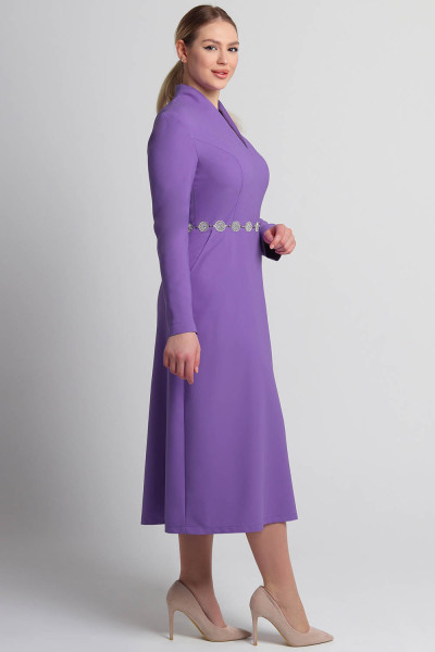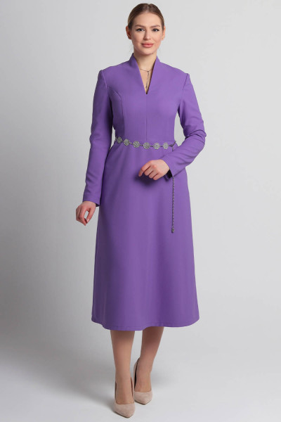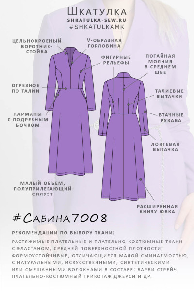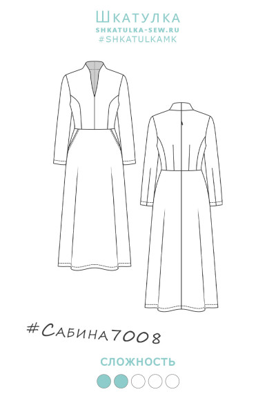 4Выкройка женского платья малого объёма, полуприлегающего силуэта, отрезного по талии, с расширенной книзу юбкой. Верхняя часть платья - с фигурными рельефами, выходящими из проймы. Нижняя часть платья - с боковыми карманами с подрезным бочком. Верхняя часть спинки - с фигурными рельефами, выходящими из проймы, плечевыми и талиевыми вытачками и средним швом. Нижняя часть спинки - со средним швом. Горловина платья V-образная, оформлена цельнокроеным воротником-стойкой, обработанным подкройной обтачкой. Застёжка - потайная молния - обработана в среднем шве спинки на небольшом расстоянии от горловины спинки. Рукава - втачные, длинные, с локтевой вытачкой.