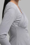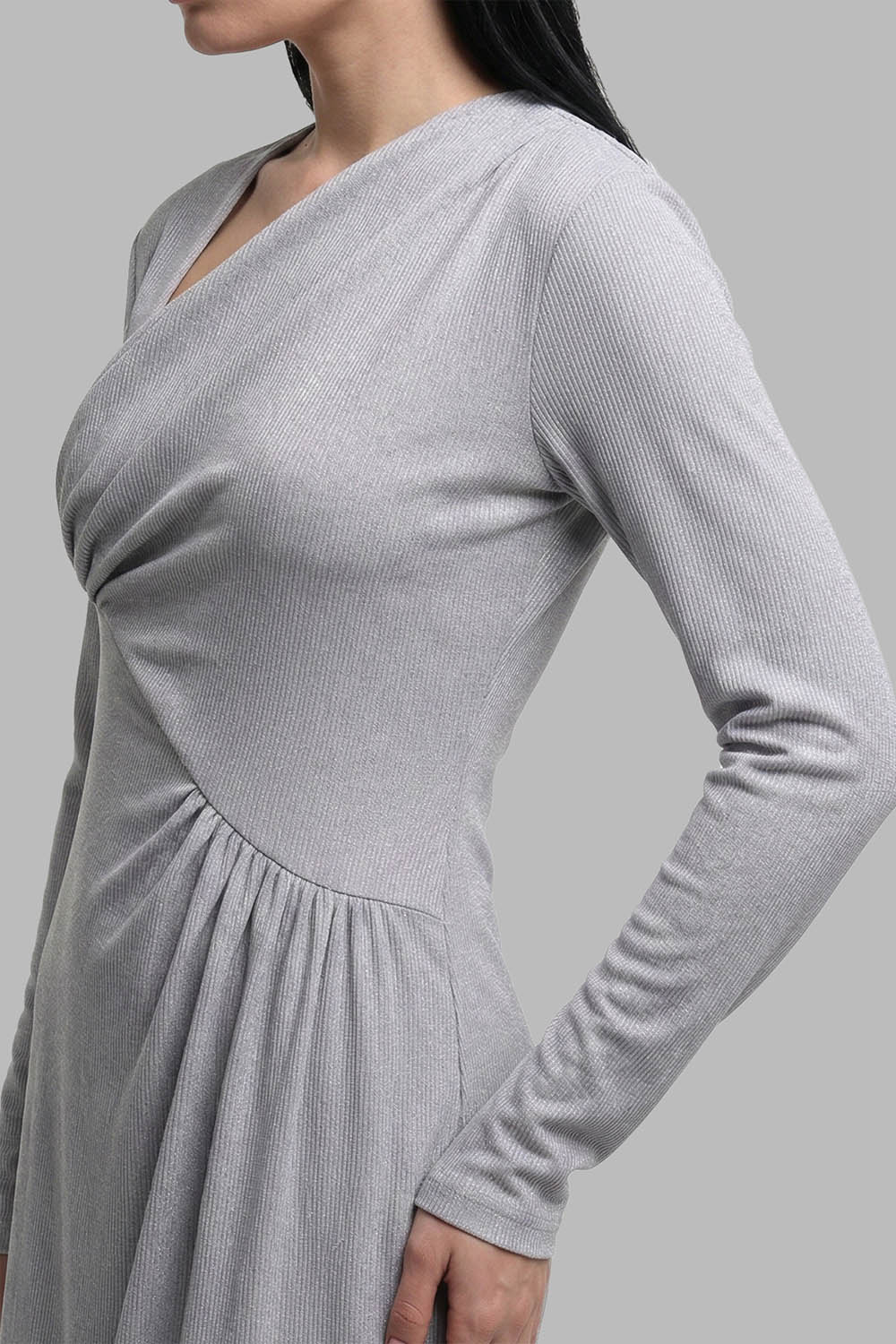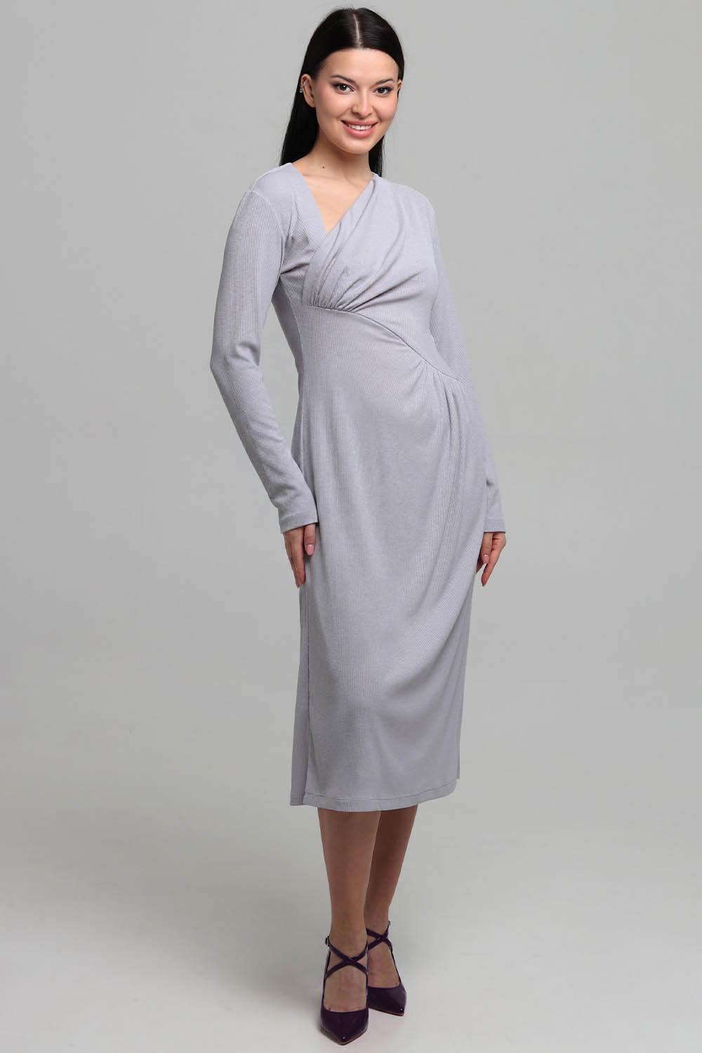 4Выкройка женского трикотажного платья малого объёма, полуприлегающего силуэта. Перед отрезной по диагонали, от области подмышки справа до линии талии слева. Верхняя часть платья состоит из большей детали, присборенной справа по нижнему срезу, и меньшей детали, образующей запАх с большей деталью. Нижняя часть переда присборена по верхнему срезу слева.