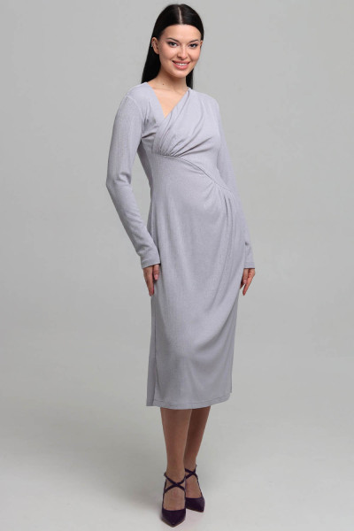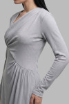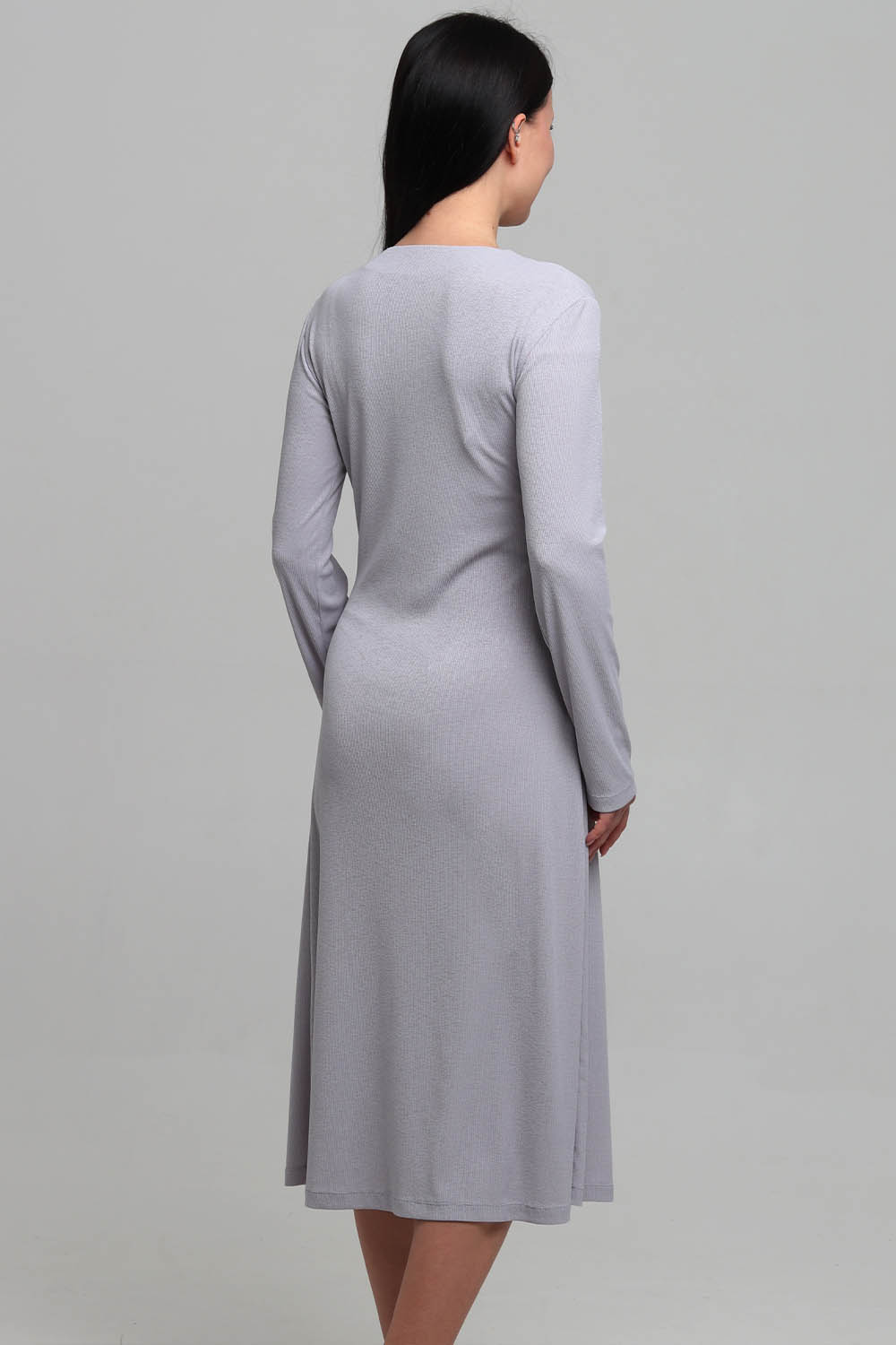 Спинка цельная, без формообразующих конструктивных элементов. Горловина платья имеет асимметричную V-образную форму. Обработана подкройной обтачкой. Рукава - втачные, длинные.