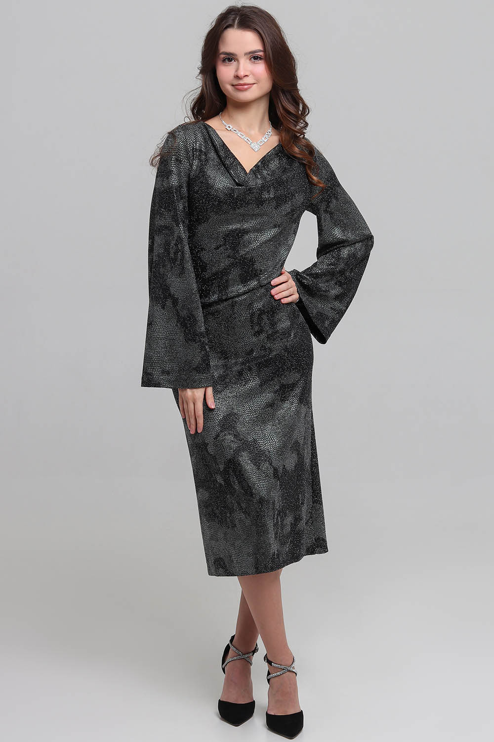 4Выкройка женского трикотажного платья малого объёма, прилегающего силуэта, немного расширенного книзу от линии бёдер. Перед - цельный. Горловина переда оформлена ниспадающей драпировкой ("водопад", "качель"), формирующейся благодаря переведённой в горловину размоделированной нагрудной вытачке и цельнокроеной обтачке горловины. Спинка - со средним швом и талиевыми вытачками. Горловина спинки обработана подкройной обтачкой. Рукава - втачные, длинные, конически расширенные книзу.
