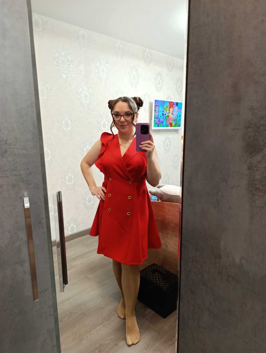 Такое универсальное платье отлично подойдет и в качестве повседневного офисного платья, и для проведения деловых переговоров, и для официальных торжественных мероприятий. Оно эффектно и презентабельно. Женщина выглядит в нем собрано и сдержано, но вместе с тем нежно и романтично. Двубортная застежка с двумя рядами пуговиц и жесткие лацканы отвечают за организованность и статусность. Приталенный силуэт с четко очерченной линией талии, воланами и расклешенной юбкой привносят в модель утонченную девичью эстетику.