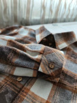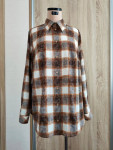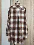 4Выкройка женской рубашки большого объёма, прямого силуэта. Перед — с нагрудными вытачками, выходящими из боковых швов. Спинка — с кокеткой и складкой по шву притачивания кокетки. Горловина рубашки оформлена отложным рубашечным воротником на отрезной стойке. Застёжка — центральная, на притачные планки, обмётанные петли и пуговицы на стойке воротника и планках. Рукава — втачные, длинные, с разрезом и притачной застёгивающейся манжетой по низу. Длина рубашки по спинке — до середины бедра, длина по переду — немного короче.