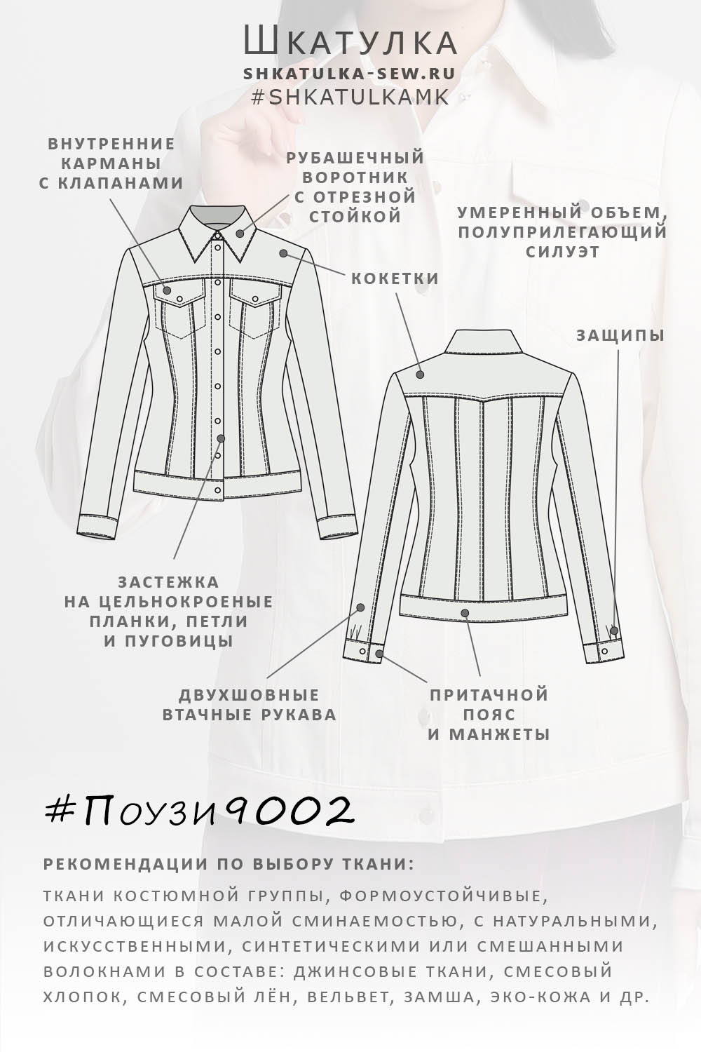 12 Для пошива изделия можно использовать ткани костюмной группы, формоустойчивые, отличающиеся малой сминаемостью, с натуральными, искусственными, синтетическими или смешанными волокнами в составе.