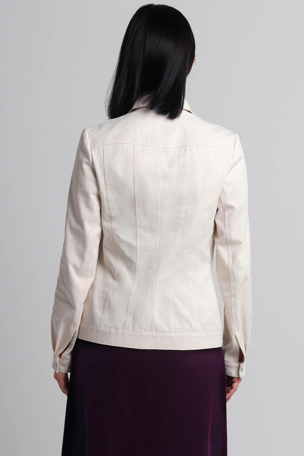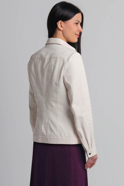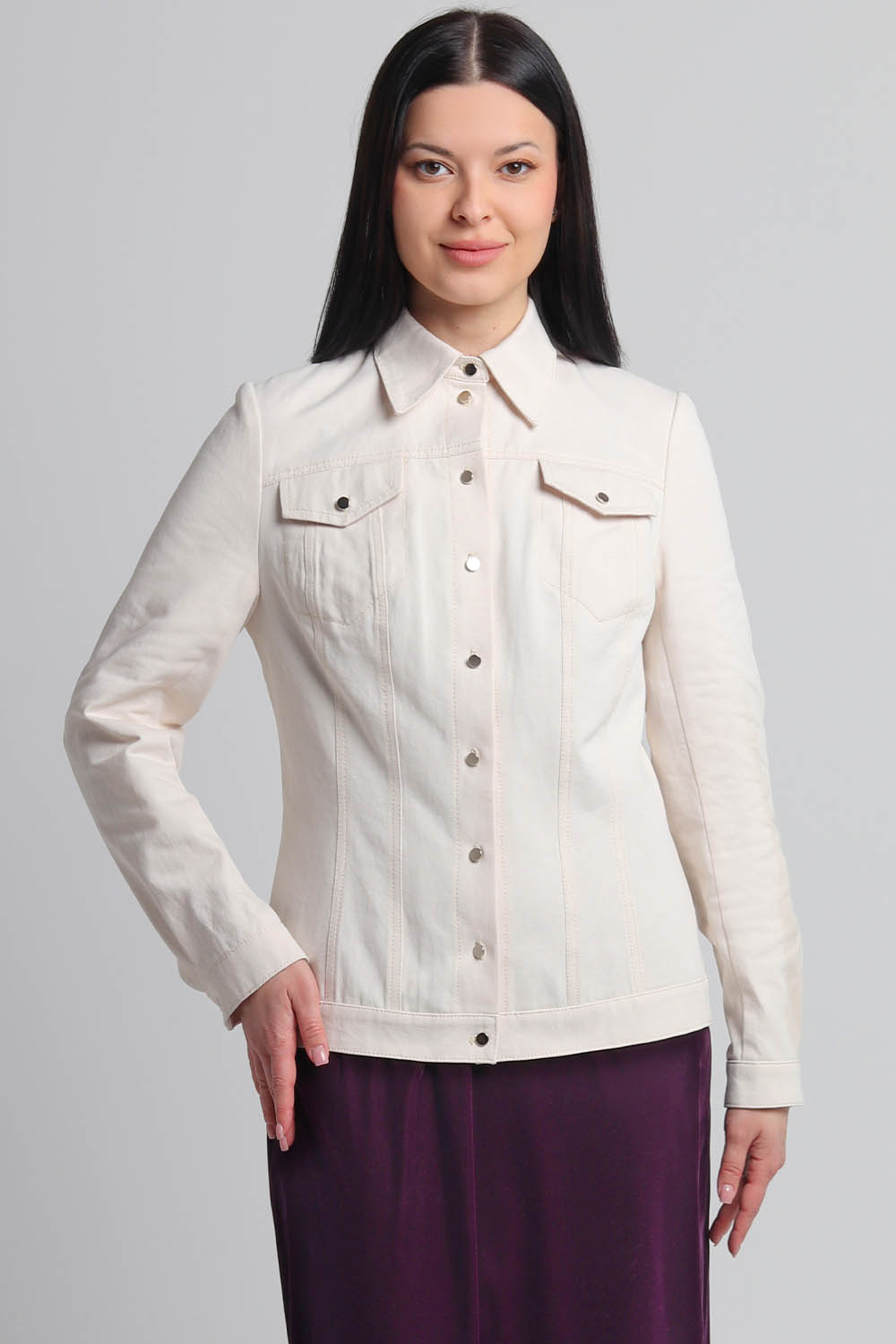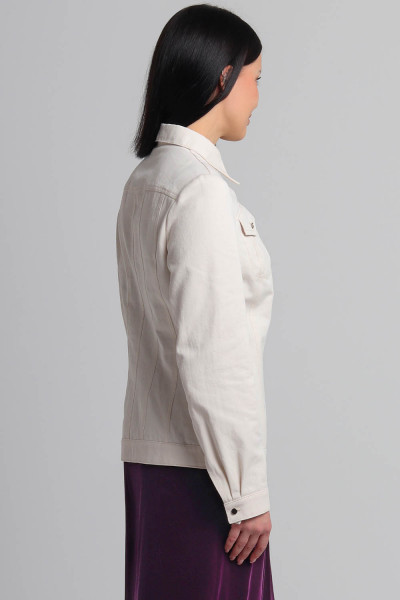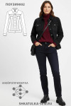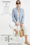 4Выкройка женской джинсовой рубашки умеренного объёма, полуприлегающего силуэта. Детали переда рубашки состоят из кокетки, бочка, средней вставки и центральной части. В швах притачивания кокеток предусмотрены внутренние карманы с клапанами. Спинка состоит из кокетки, центральной части, средних вставок и бочков. Горловина рубашки оформлена рубашечным воротником с отрезной стойкой. Застёжка - центральная, на цельнокроеные планки, обмётанные петли и пуговицы. Рукава - втачные, двухшовные, с разрезом по низу локтевого шва, с защипами, на притачной застёгивающейся манжете. По низу рубашки предусмотрен притачной пояс.