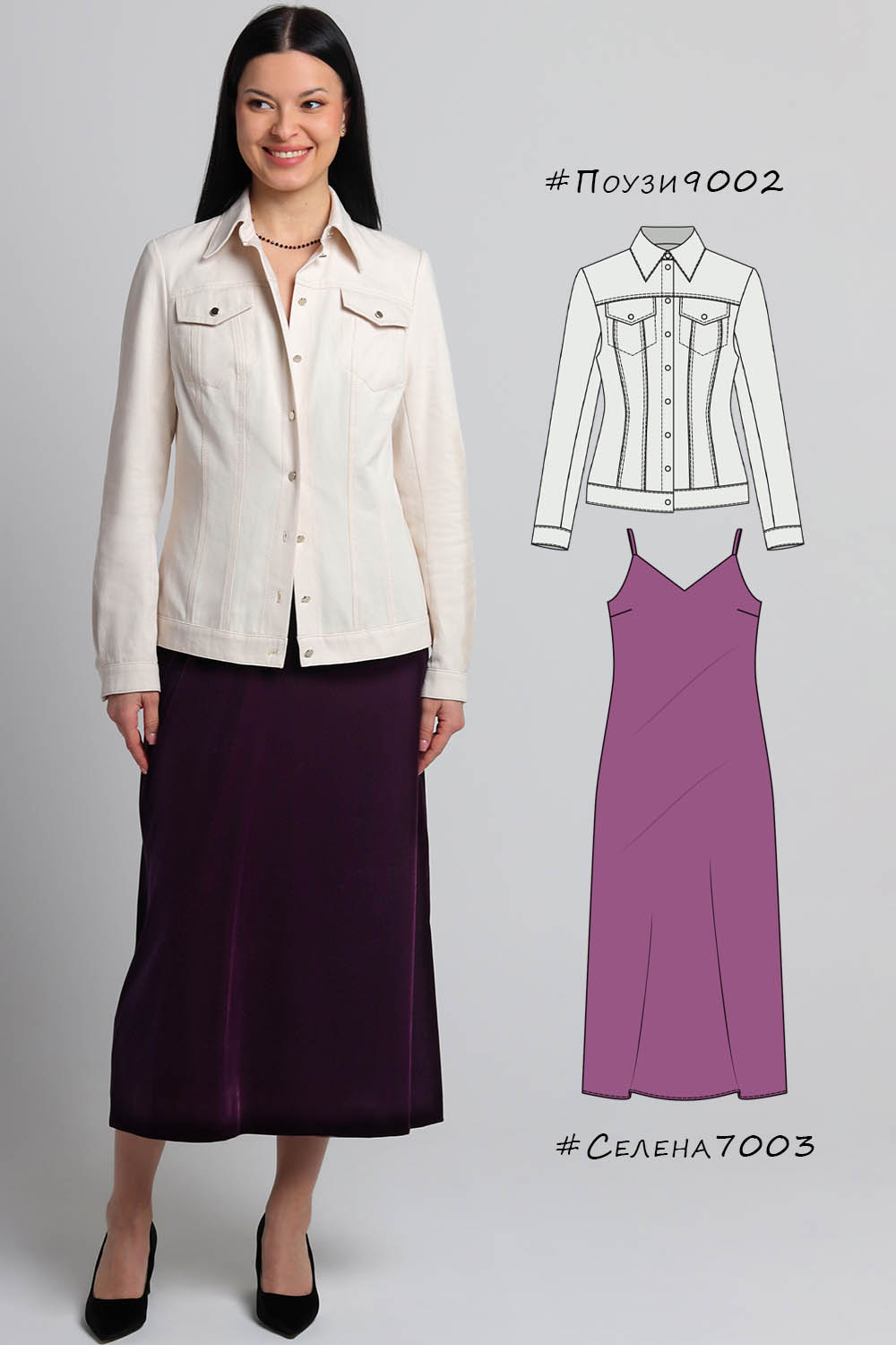 10Параметры модели: рост 175 см, обхват груди 88 см, обхват талии 74 см, обхват бедер 100 см. Выбрана выкройка 44 размера, рост 171-175 см. Корректировки не выполнялись.