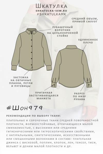 Для пошива рубашки можно использовать плательные и сорочечные ткани средней поверхностной плотности, формоустойчивые, отличающиеся малой сминаемостью, с высокими или средними гигиеническими или гигроскопическими свойствами, с натуральными, синтетическими, искусственными или смешанными волокнами в составе.