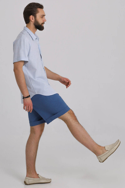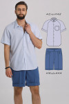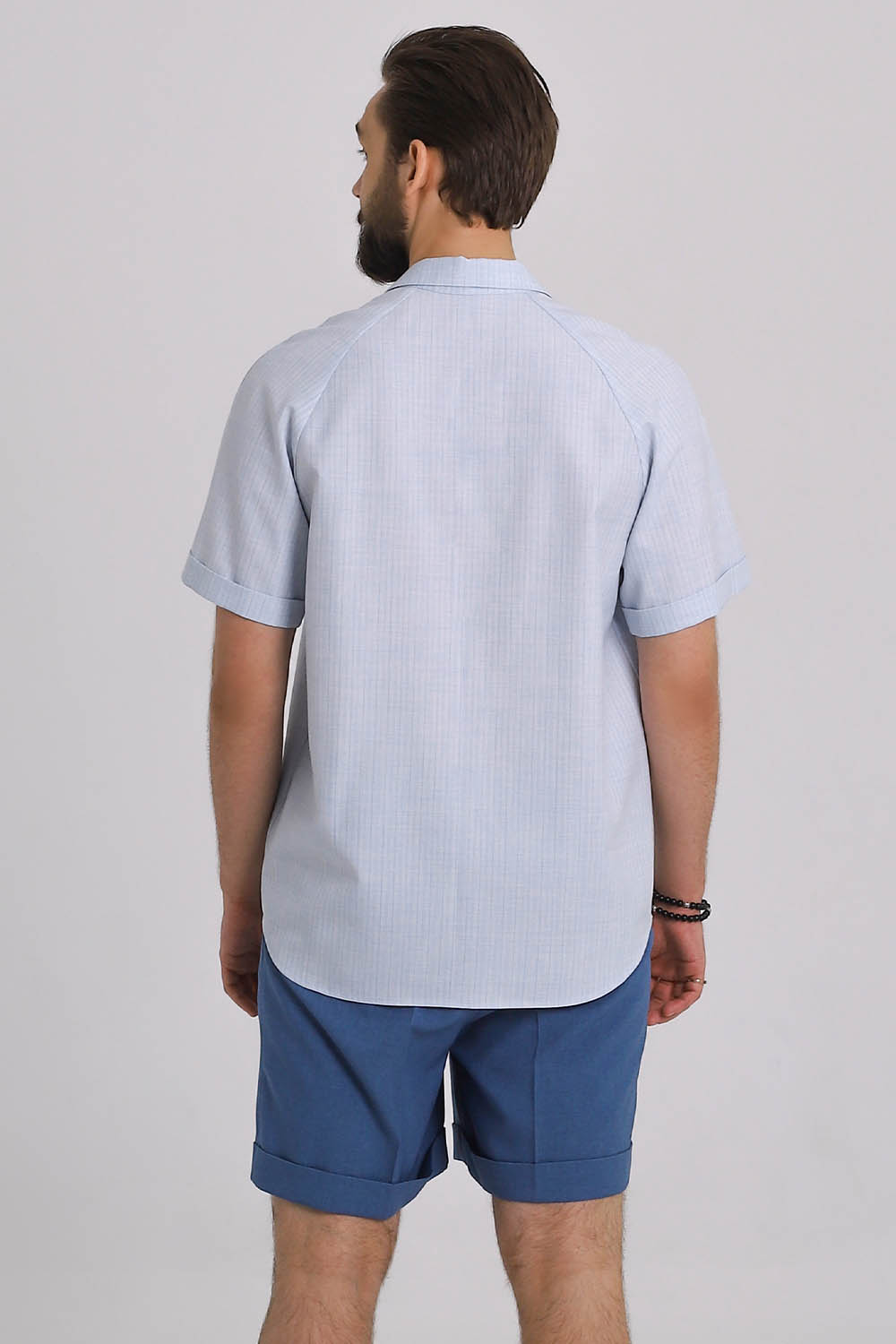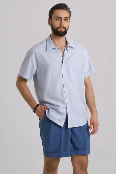 4Выкройка мужской рубашки среднего объёма, прямого силуэта. Перед — цельный, на левой детали — нагрудный накладной карман. Спинка — цельная, без особенностей. Горловина рубашки оформлена отложным рубашечным воротником на отрезной стойке. Застёжка — центральная, на цельнокроеные планки, обмётанные петли и пуговицы. Рукава — покроя реглан, с плечевой вытачкой, короткие (выше локтя), с цельнокроеными отворотами по низу. Линия низа рубашки на полочке и спинке — фигурная.