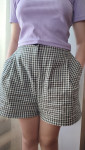Шорты женские умеренного объёма, полуприлегающего силуэта. С подкройным поясом, собранном на спинке на резинку. Со складками по талии, карманами с подрезным бочком и застёжкой-гульфиком на передних половинках. По длине - короткие.