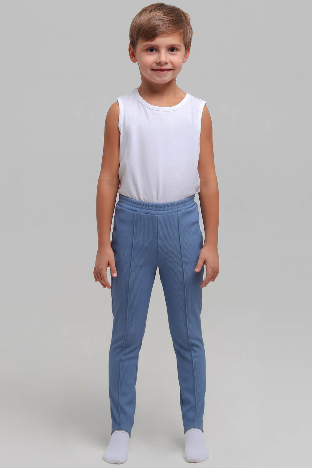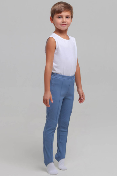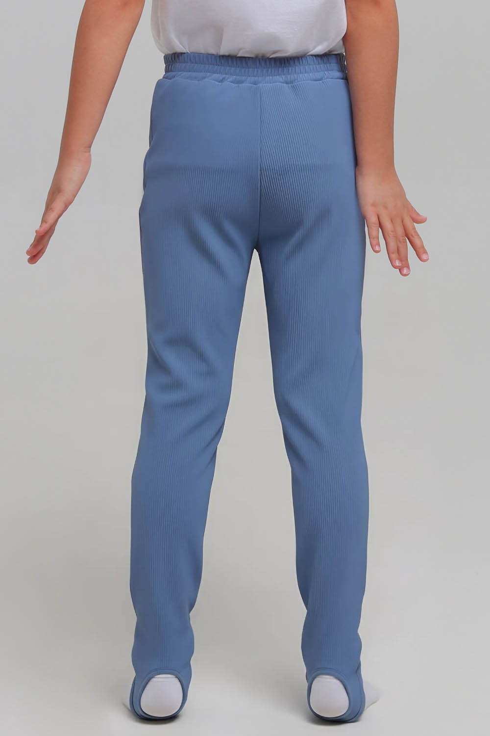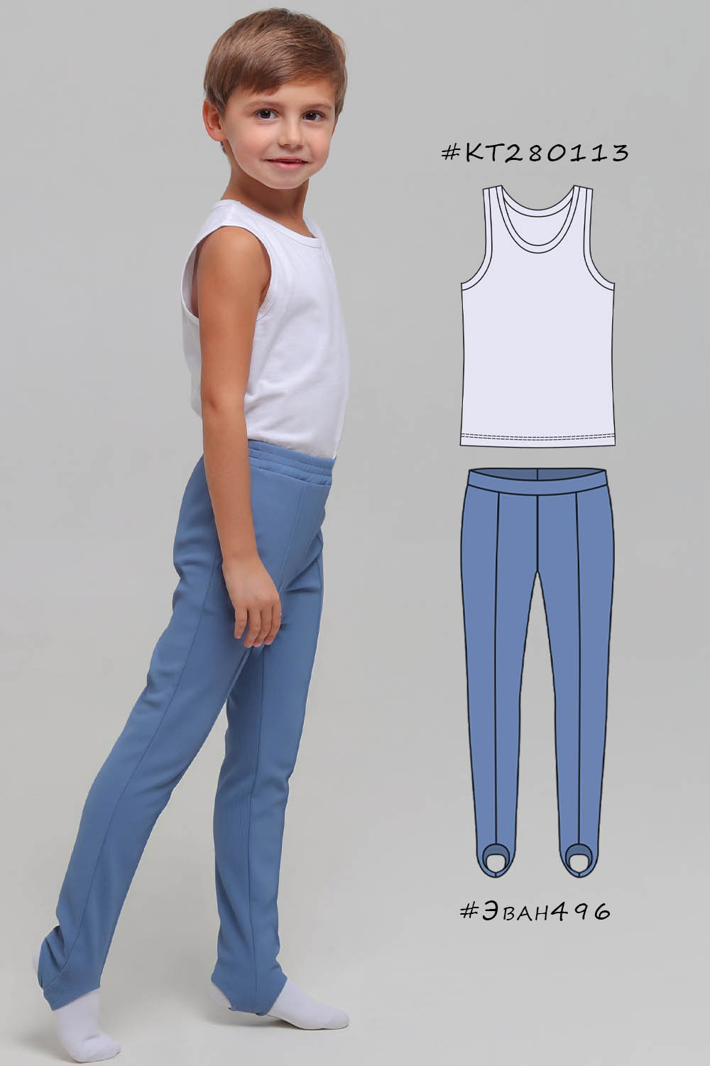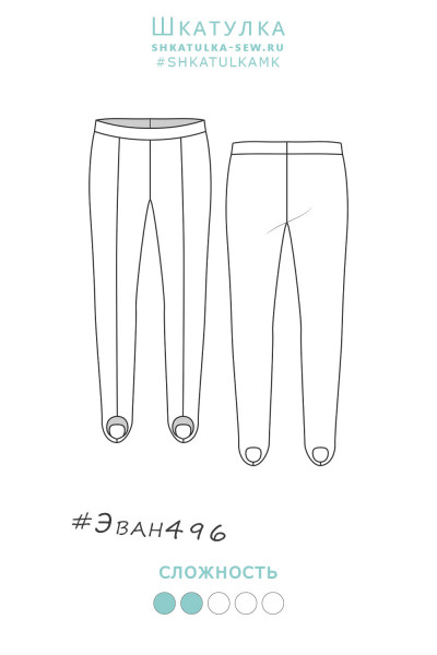 4Выкройка детского трико для гимнастики, малого объёма, полуприлегающего силуэта. Передние половинки трико - с вертикальными застроченными стрелками. Задние половинки - цельные, без формообразующих конструктивных элементов. Верхний срез трико обработан притачным поясом на резинке. По низу брючин предусмотрены штрипки для фиксации на стопе.