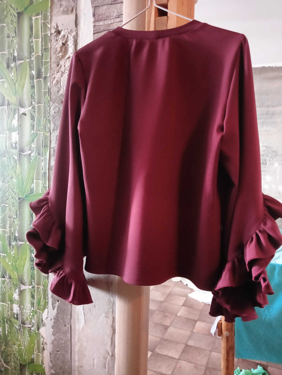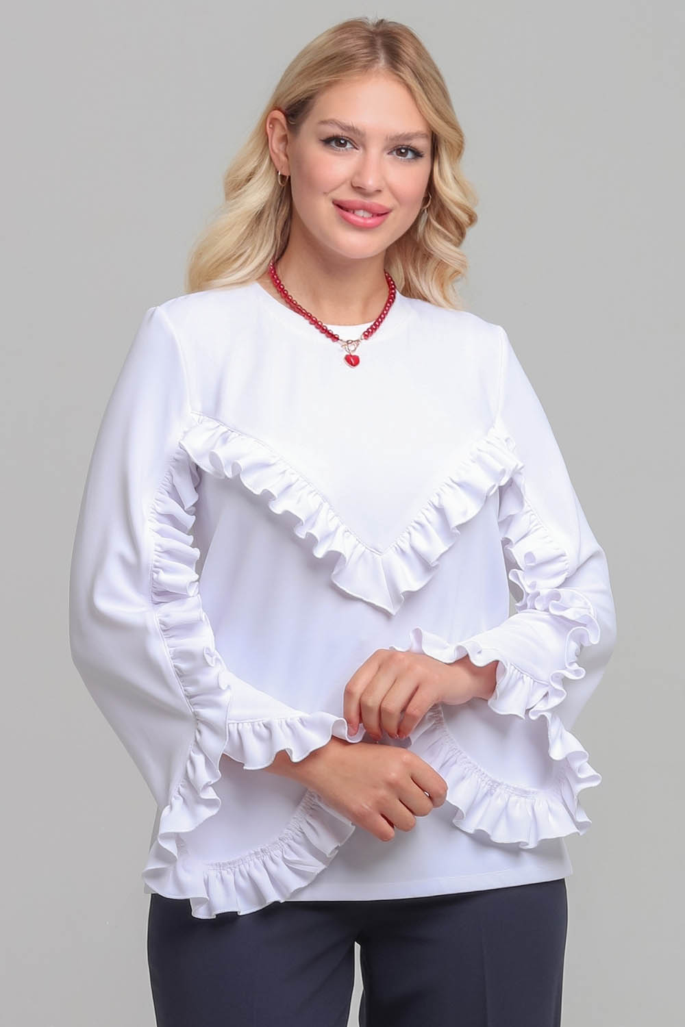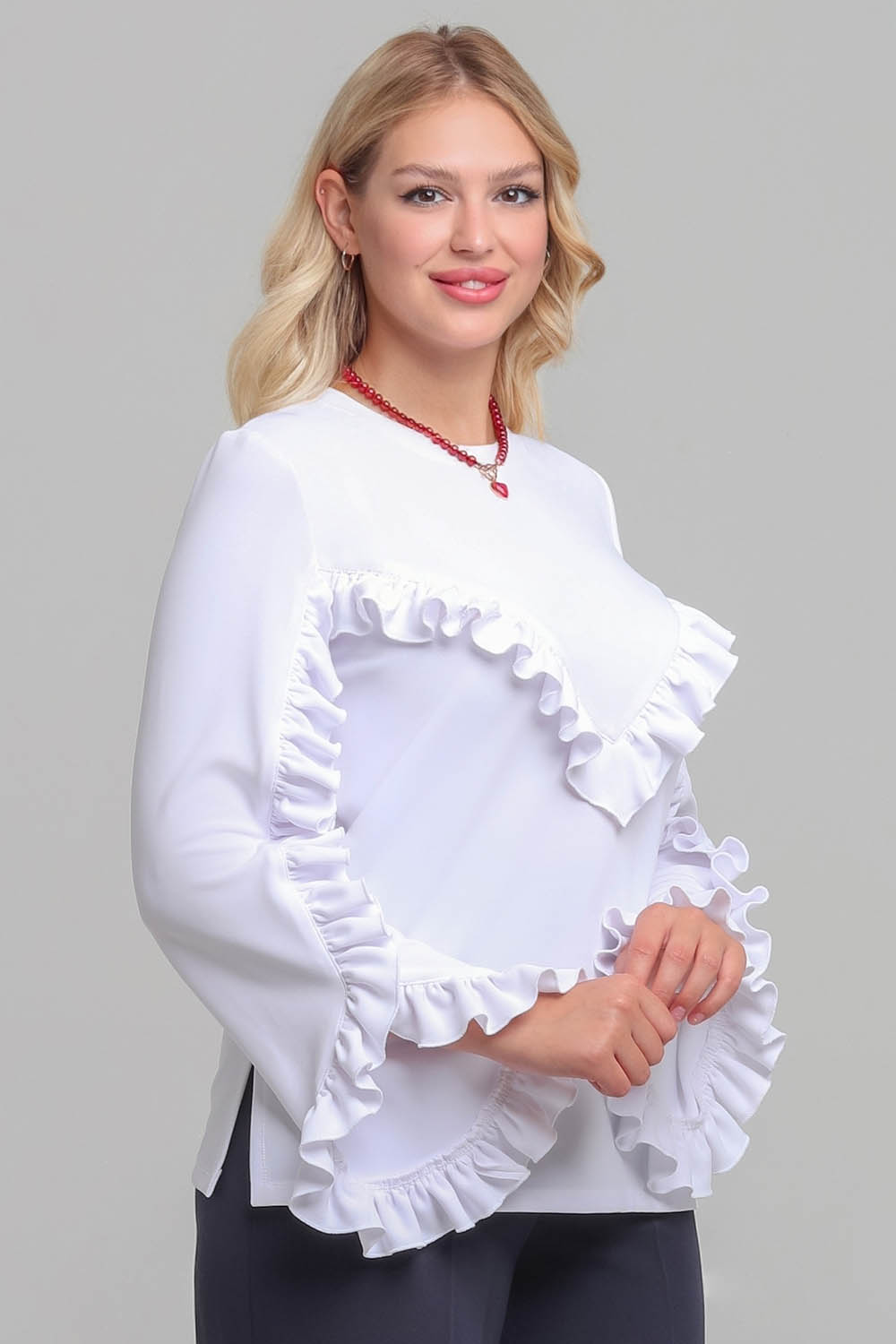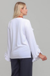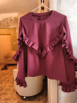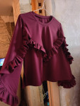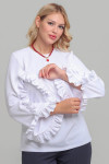 4Выкройка женского трикотажного свитшота умеренного объёма, прямого силуэта. Перед - с V-образной кокеткой. Спинка - цельная, без формообразующих конструктивных элементов. Горловина изделия - круглой формы, обработана трикотажной обтачкой. Рукава - втачные, длинные, со смещённым в сторону переда швом, с фигурной линией низа. В шве притачивания кокетки переда, шве и по низу рукавов предусмотрена оборка. Длина свитшота - до линии бёдер.