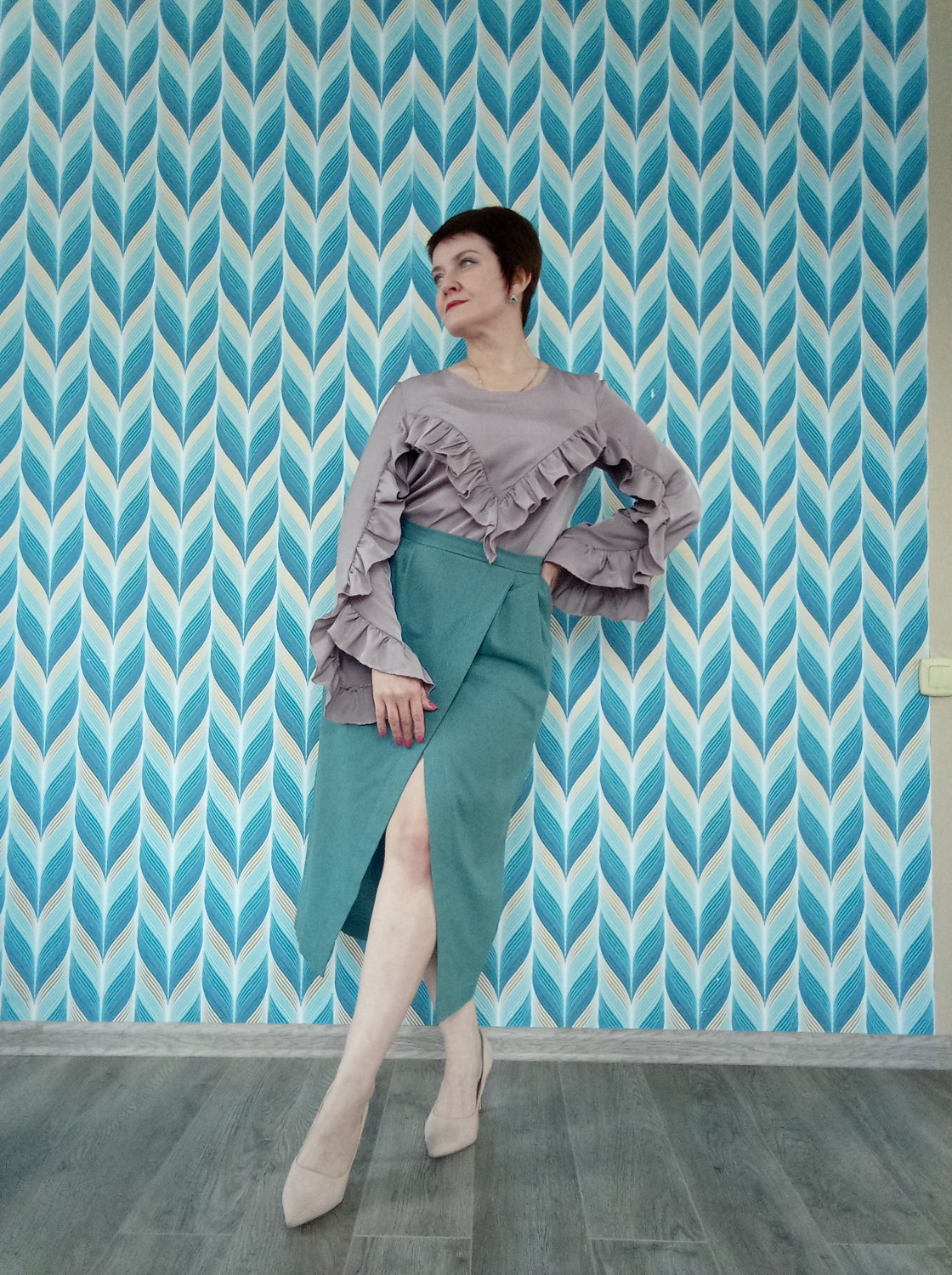 10Параметры модели: рост 173 см, обхват груди 92 см, обхват талии 76 см, обхват бедер 106 см. Выбрана выкройка 46 размера, рост 171-175 см. Корректировки не выполнялись.