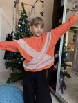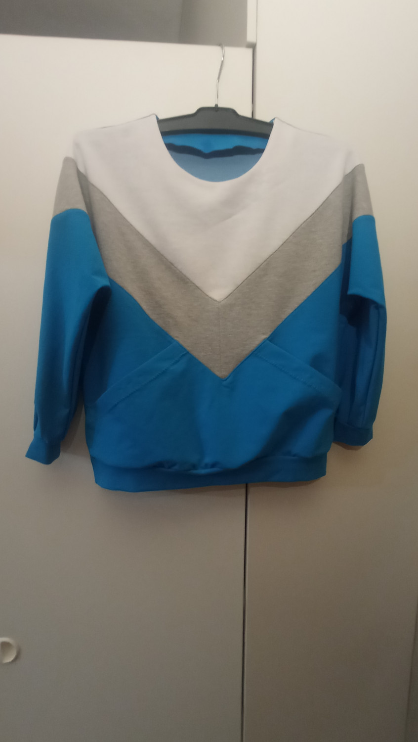 4Выкройка детского свитшота среднего объёма, прямого силуэта. Изделие выполнено из материалов трёх видов. Перед — с V-образной вставкой, с накладным карманом «кенгуру», расположенным по центру переда, выполненными из отделочного материала контрастного цвета. Спинка — цельная, без особенностей. Горловина свитшота — круглой формы, обработана трикотажной обтачкой. Рукава — цельнокроеные, длинные, с трикотажной манжетой по низу. По низу свитшота предусмотрен трикотажный пояс.