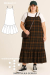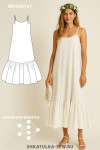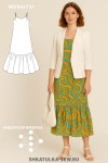 Выкройка женского сарафана умеренного объёма, А-силуэта. Перед — с нагрудными вытачками, выходящими из пройм. Спинка — цельная, без особенностей. По низу сарафана предусмотрена широкая оборка со сборкой по шву притачивания к изделию. Верх сарафана — на тонких бретелях, обработан подкройными обтачками. Длина изделия — до щиколотки.
