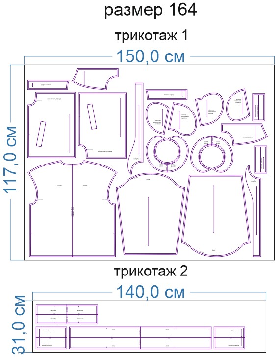 Образцы раскладки на трикотаже для выборочных размеров (расчет выполнен для однотонного трикотажа без учета направления ворса):