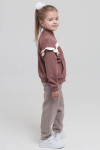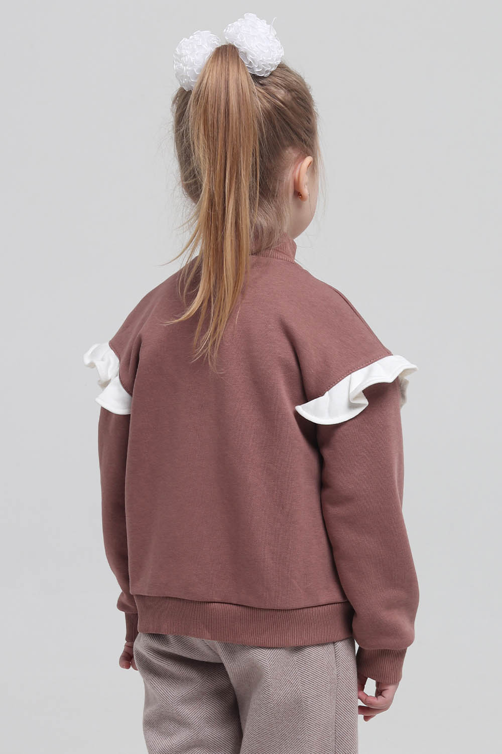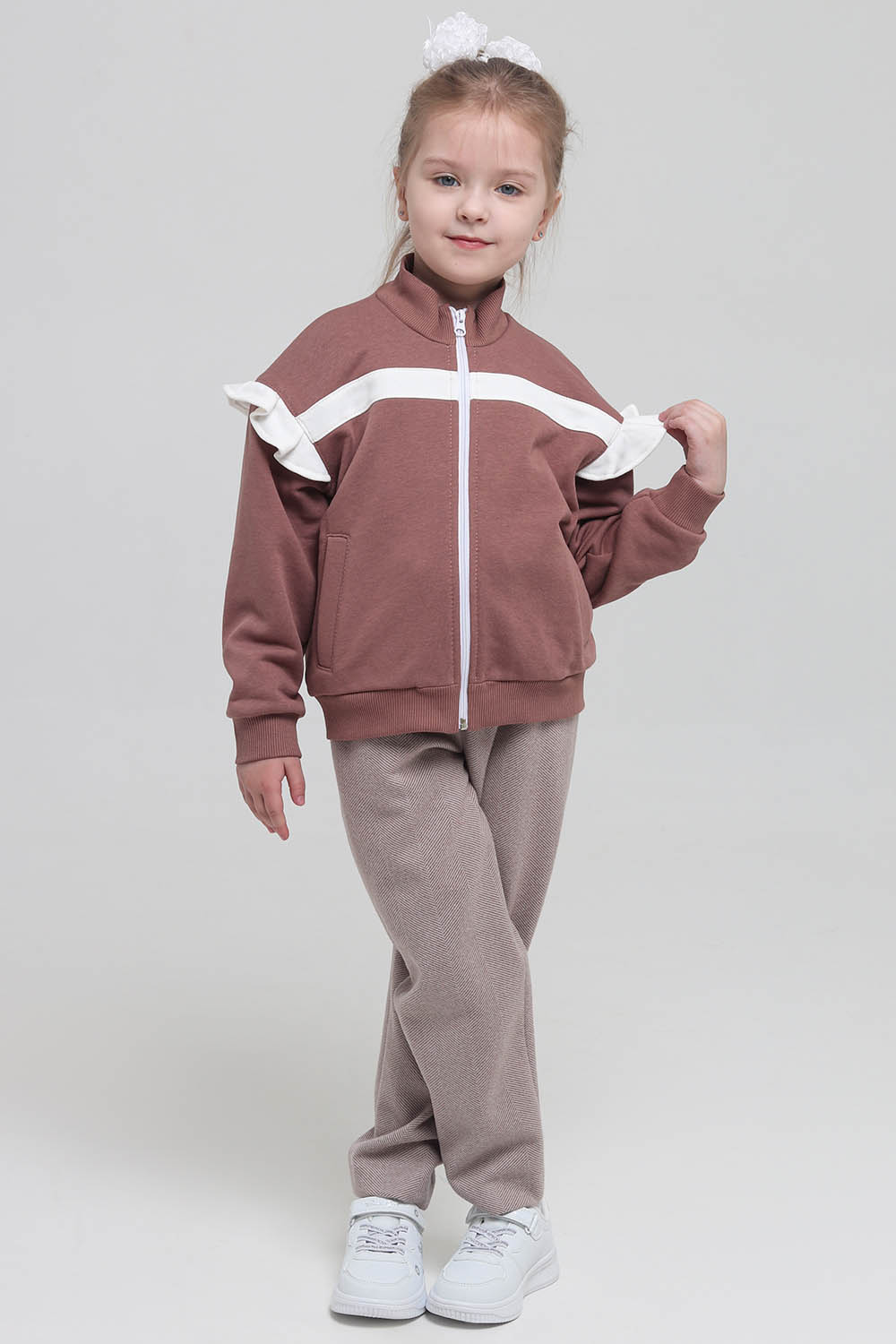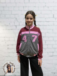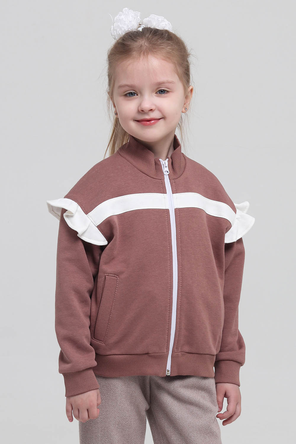 4Выкройка детской толстовки умеренного объёма, прямого силуэта, со спущенной линей плеча, выполненной из основного материала двух цветов. Детали переда выполнены с контрастными вставками-полосками в области груди, с боковыми, диагонально ориентированными прорезными карманами с листочками. Спинка - цельная, без формообразующих конструктивных элементов. Горловина толстовки оформлена воротником-стойкой. Застёжка - центральная, на разъёмную молнию. Рукава - рубашечного покроя, длинные, на круговой трикотажной манжете по низу. В швах втачивания рукавов предусмотрены контрастные оборки. По низу толстовки предусмотрен круговой трикотажный пояс. Длина изделия - до линии бёдер.