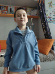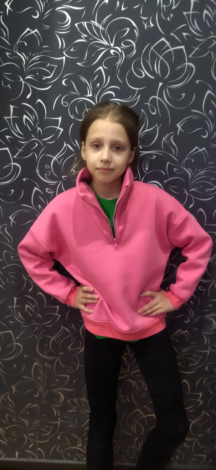 4Выкройка детского трикотажного пуловера среднего объёма, прямого силуэта, со спущенной линией плеча на основе цельнокроеного рукава. Перед и спинка — цельные, без особенностей. Горловина пуловера имеет V-образную форму, оформлена отложным воротником, застёгивающимся на молнию. Рукава  длинные, на притачной круговой манжете по низу.