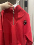 Длина изделия — до линии бёдер. По низу пуловера предусмотрен трикотажный пояс.