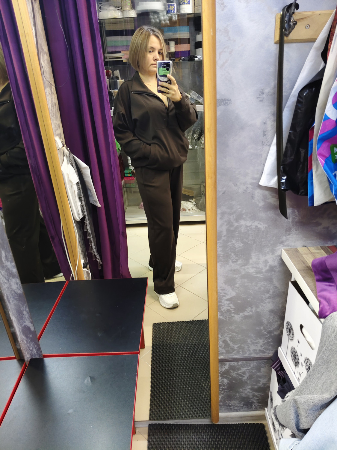 Образец сшит из трикотажа футер 3-нитка с начесом, пояс и манжеты выполнены из трикотажа кашкорсе.
