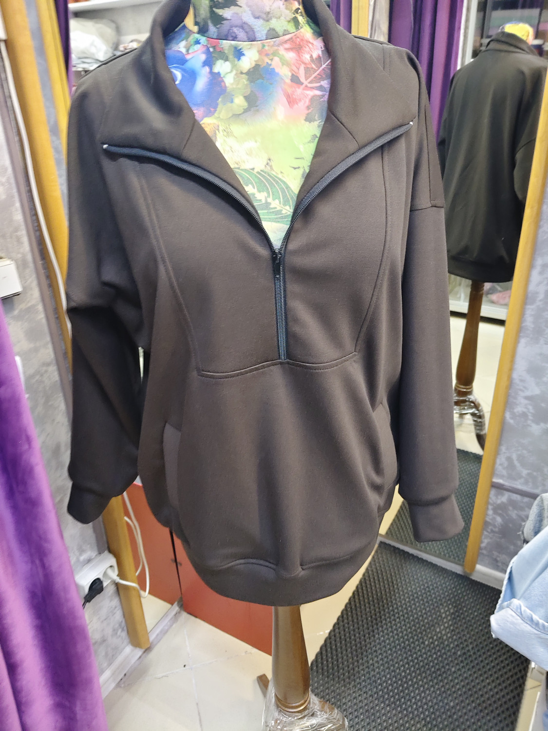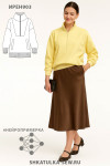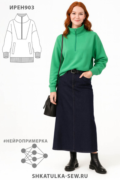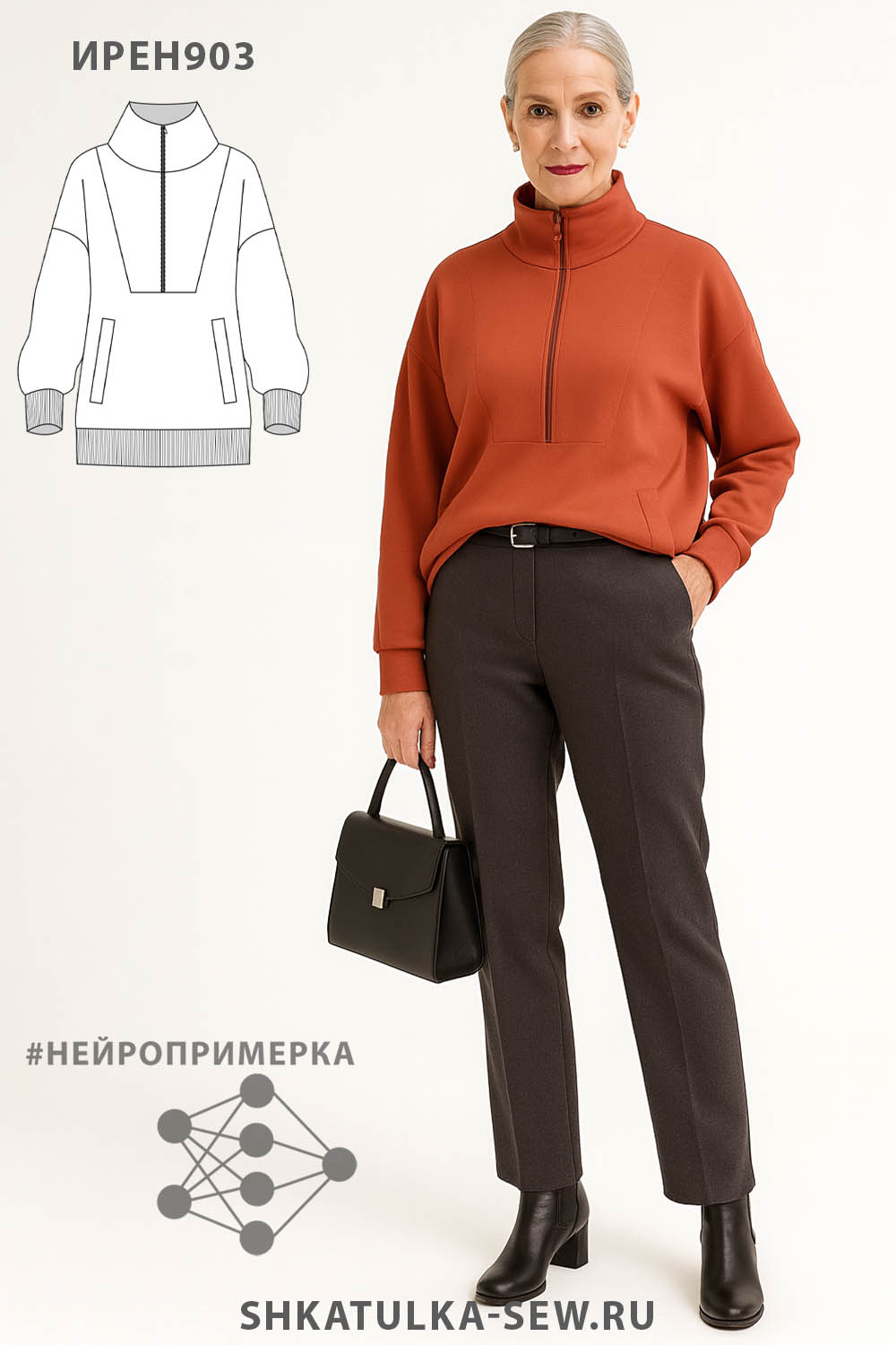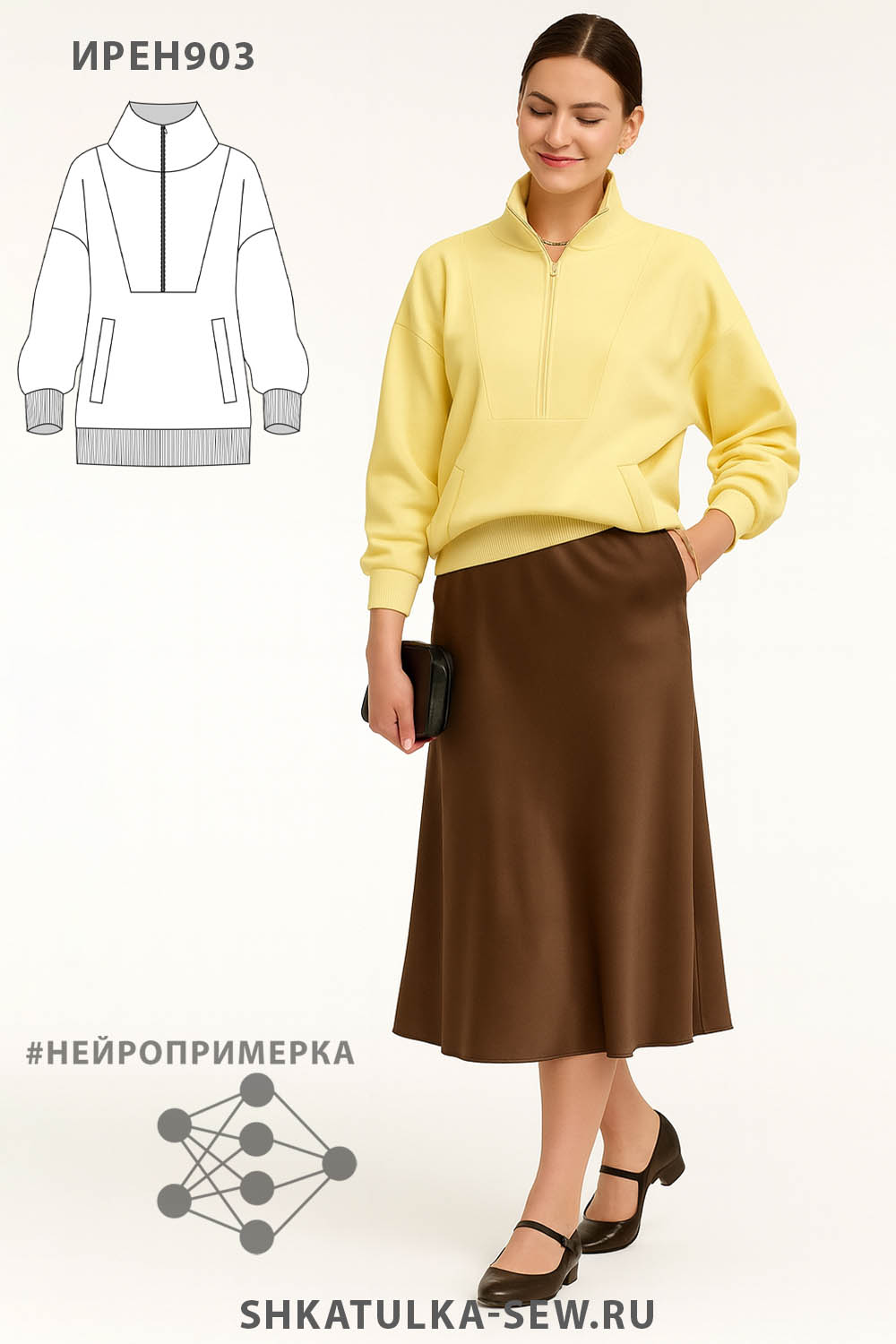 4Выкройка женской трикотажной толстовки среднего объёма прямого силуэта, со спущенной линией плеча. Перед — с центральной вставкой, с боковыми карманами с листочками. Спинка — цельная, без особенностей. Горловина толстовки обработана широким воротником-стойкой. Застёжка — молния, расположенная по центру вставки переда, доходит до верха воротника. Рукава сконструированы из цельнокроеной основы, длинные, с трикотажными манжетами по низу. Длина толстовки — до линии бёдер. По низу изделия предусмотрен широкий трикотажный пояс.