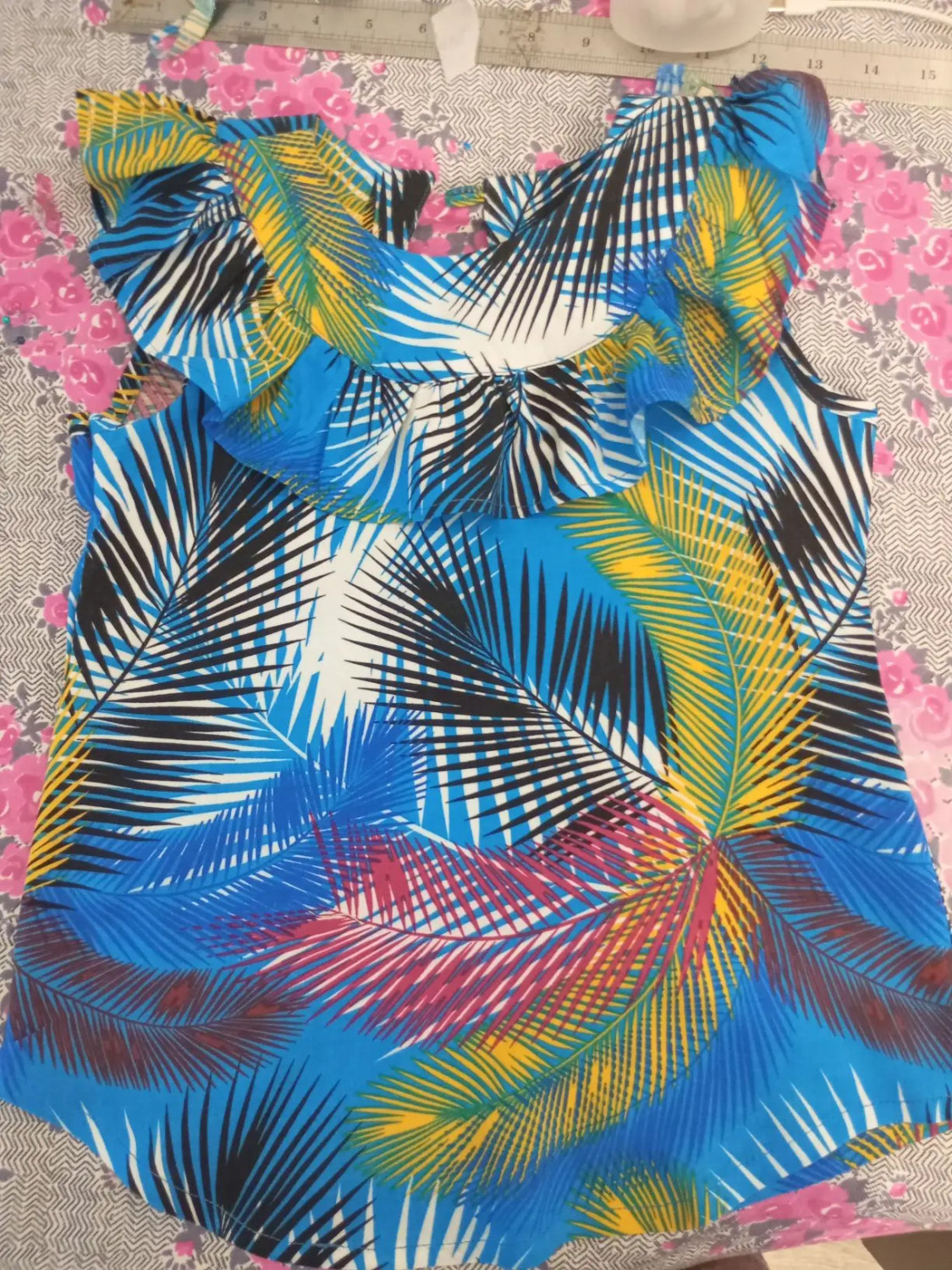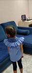 4Выкройка детского топа умеренного объёма, полуприлегающего силуэта. Перед - с круглой кокеткой и двумя рядами оборок разной ширины, переходящих с переда на спинку. Спинка - со средним швом, с круглой кокеткой и двумя рядами оборок разной ширины. Горловина топа имеет круглую форму, обработана вчистую внутренними кокетками. Застёжка - разрез, застёгивающийся на воздушную петлю и пуговицу; расположена в среднем шве спинки. Проймы топа обработаны вчистую косой бейкой. Длина топа - до линии бёдер.