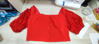 Выкройка укороченного прилегающего топа pdf с объемными рукавами. Лиф оформлен чашками со сборкой и перемычкой. В области плеч вставлена эластичная тесьма (резинка) средней ширины. Перед и спинка на подкладке из батиста.
