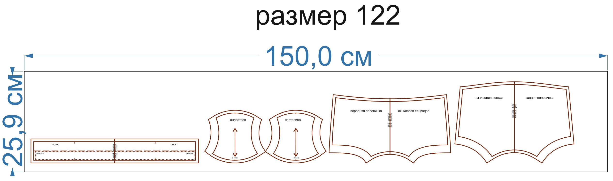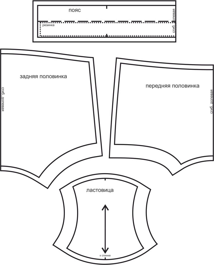 Выкройка трусиков-шортиков для девочки. Состоит из передней и задней деталей, пояса, отрезной ластовицы.