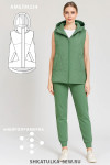 4Выкройка утеплённого женского жилета среднего объёма, немного расширенного к низу. Перед — с фигурными рельефами, с боковыми прорезными карманами с листочками. Спинка — цельная. На спинке и центральных деталях переда предусмотрена стёжка. Застёжка — центральная, на разъёмную молнию и ветрозащитную планку. Горловина жилета оформлена воротником-стойкой и пристёгивающимся двухшовным капюшоном с кулиской. Внутрь кулиски вставлена шляпная резинка с регуляторами, позволяющими менять степень прилегания капюшона к голове. Длина жилета — до середины бедра. Спинка немного удлинена по низу, форма низа спинки — скруглённая.