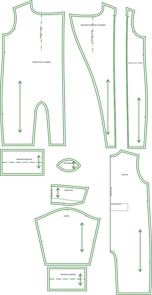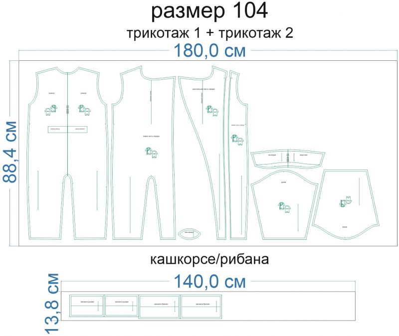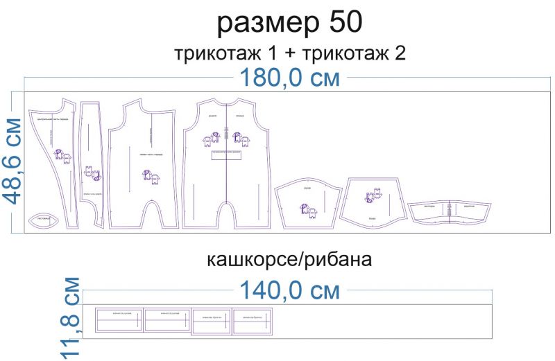 Для изготовления комбинезона подойдут трикотажные полотна средней поверхностной плотности, средней степени растяжимости, тактильно мягкие, с высокими гигиеническими и гигроскопическими свойствами.