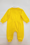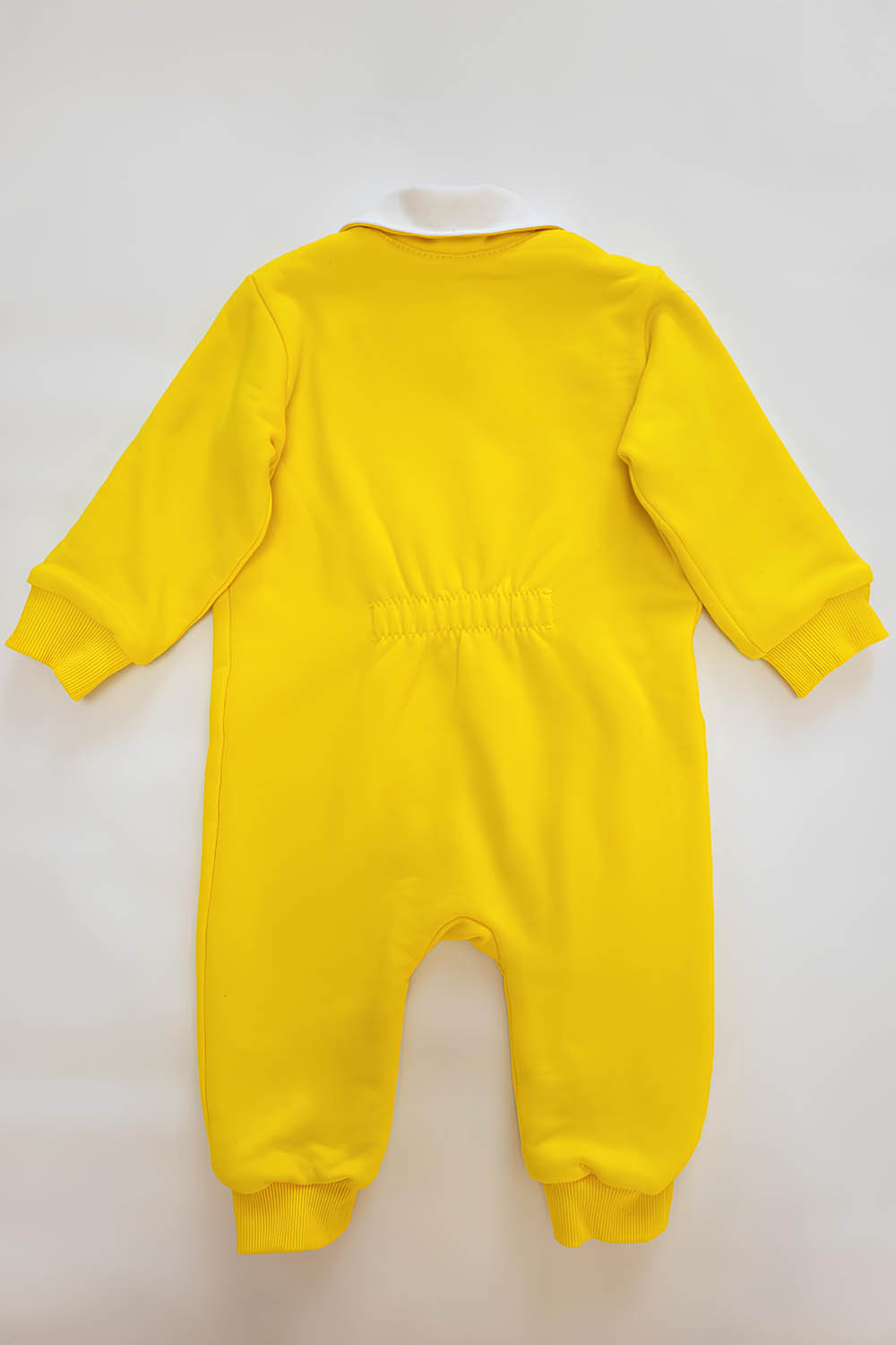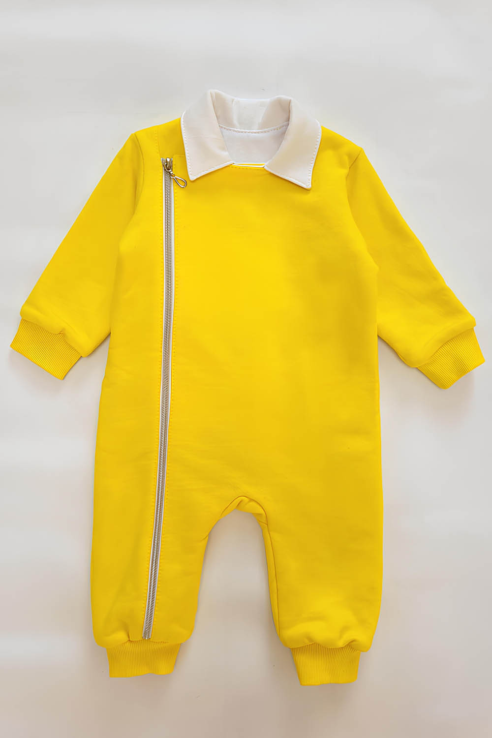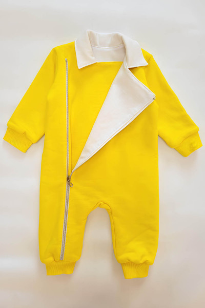 4Выкройка трикотажного ясельного комбинезона-косухи, умеренного объёма, прямого силуэта, выполненного на подкладке. Перед — с вертикальными рельефами, выходящими из плечевых швов. Спинка — цельная, с резинкой в области талии. Застёжка — смещённая, на молнию, втачанную в рельеф. Воротник —  английского типа, с отложными лацканами, из контрастной ткани подкладки комбинезона. Рукав — рубашечного покроя, умеренного объёма, длинный, с притачной трикотажной манжетой по низу. В шаговом шве комбинезона предусмотрена ластовица, обеспечивающая свободу движений ребёнка. Брючины комбинезона длинные, по низу оформленные трикотажными манжетами.