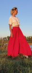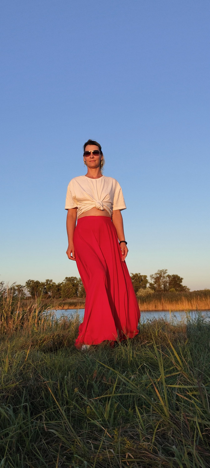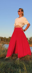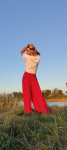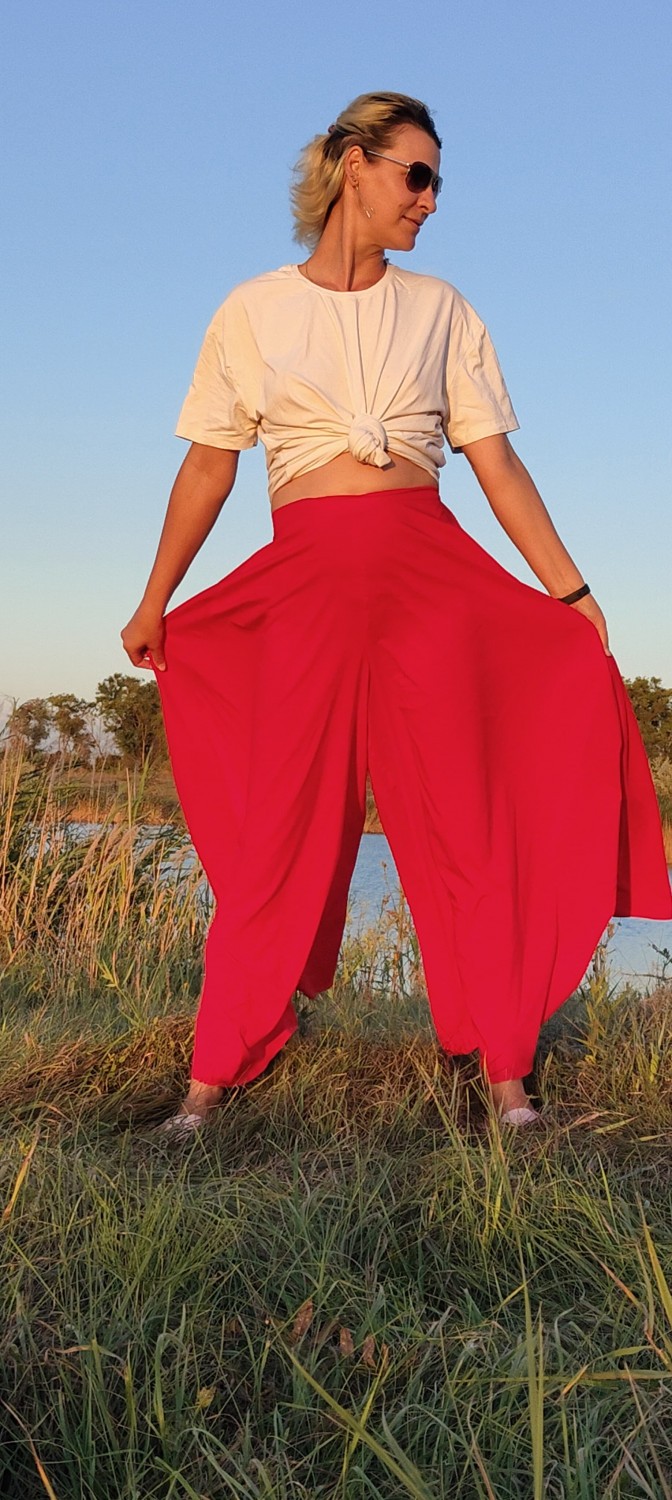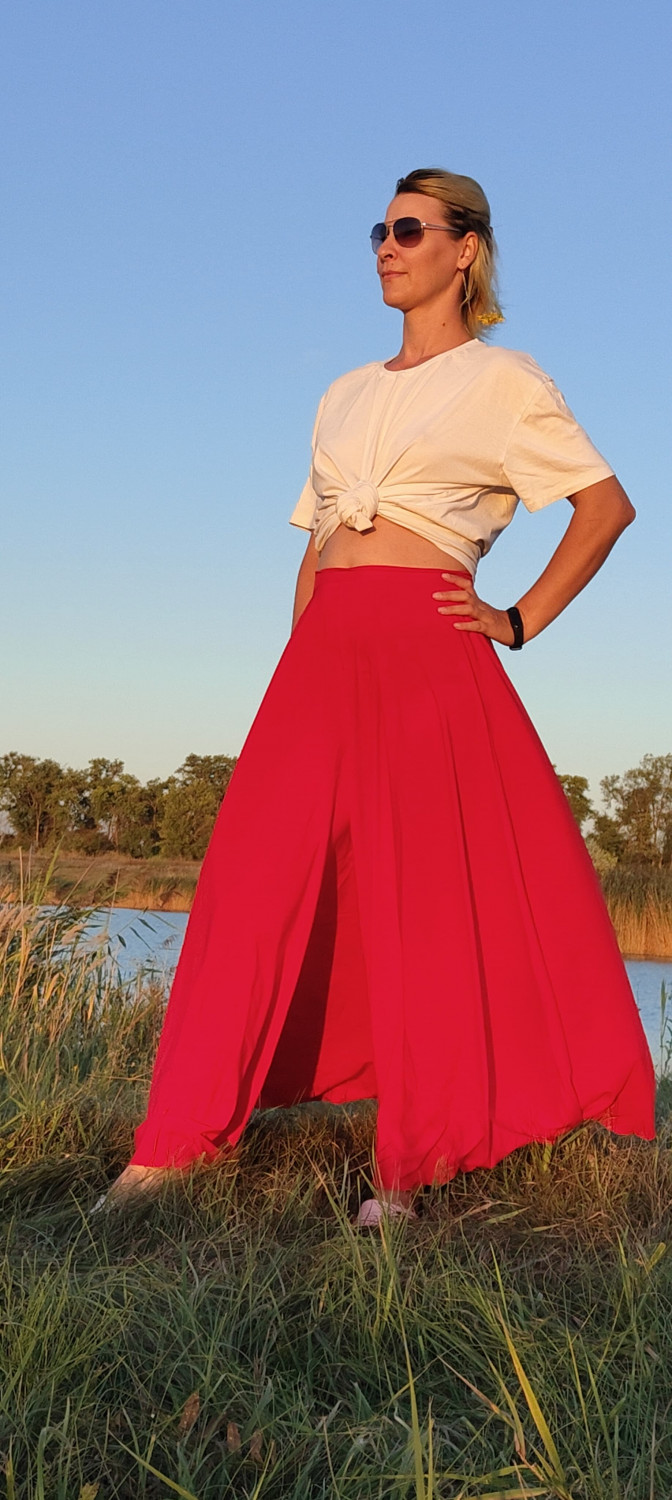 4Выкройка юбки-брюк по типу "полусолнце" на притачном поясе. Застежка в боковом шве на потайную молнию. Линия сидения занижена для большей свободы движений. Брюки выполнены из двух слоев ткани: верхний - шифон, нижний - шелк. Можно сшить их однослойными без подкладки, если материал не прозрачный.