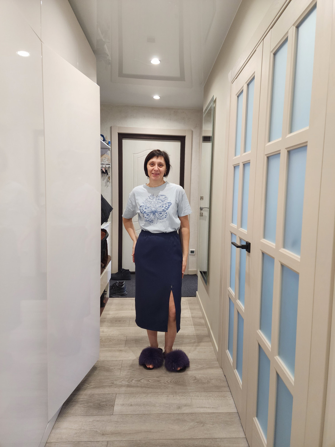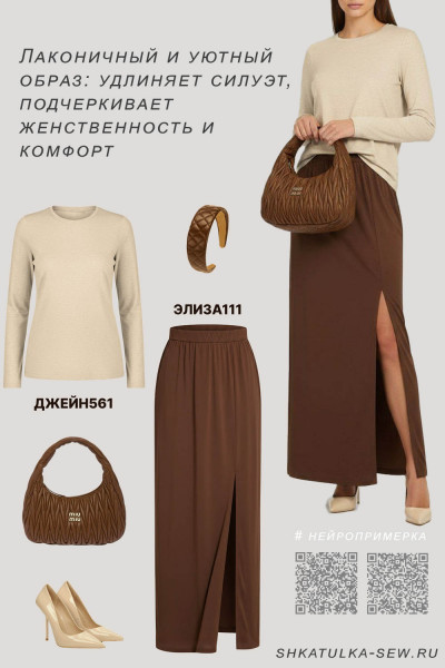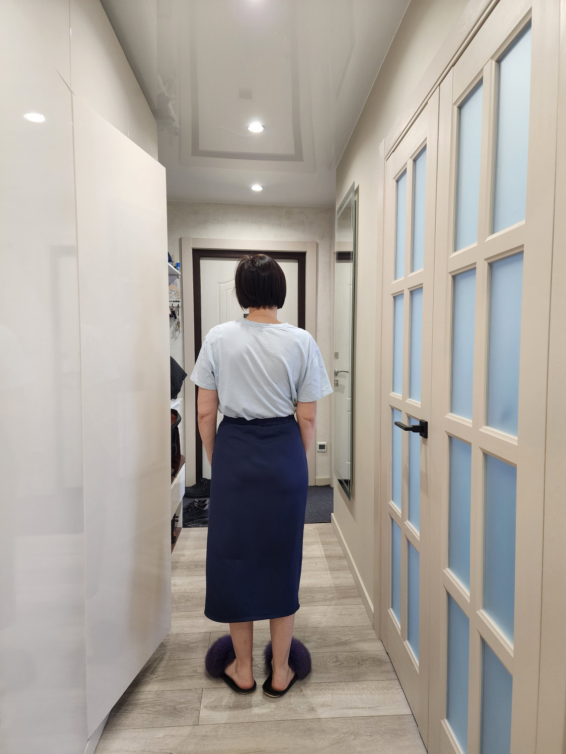 4Выкройка женской трикотажной юбки малого объёма, прилегающего силуэта, без застежки. Переднее полотнище юбки — со смещённым относительно центра вертикальным рельефом, с высоким разрезом в нём. Заднее полотнище юбки цельное, без особенностей. Верхний срез юбки обработан притачным поясом на резинке. Юбка длиной выше щиколотки, немного зауженная книзу.