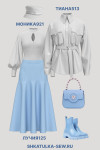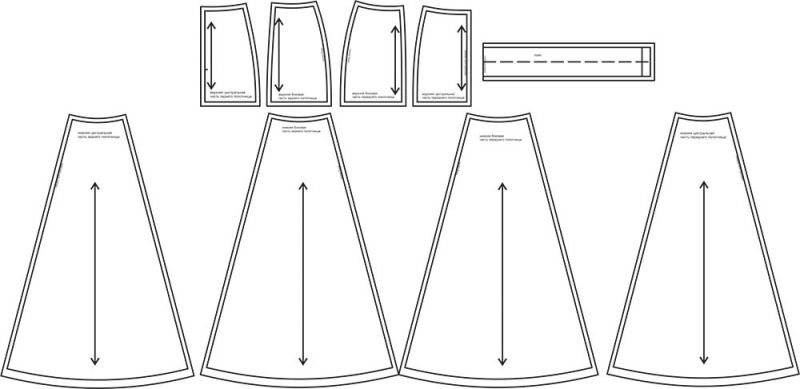 4Выкройка женской юбки 8-клинки умеренного объёма, полуприлегающего силуэта, отрезной по линии бёдер, с расширенной книзу нижней частью. Верхняя часть переднего полотнища состоит из верхних центральных и боковых частей. Нижняя часть переднего полотнища состоит нижних центральных и боковых частей. Верхняя часть заднего полотнища состоит из верхних центральных и боковых частей. Нижняя часть заднего полотнища состоит из нижних центральных и боковых частей. Верхний срез юбки обработан притачным поясом.