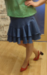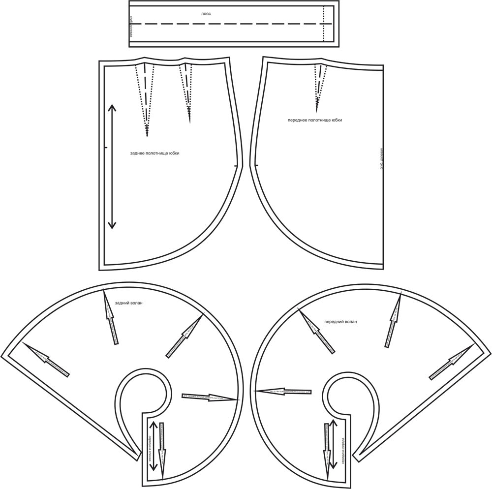 4Выкройка юбки расширенного размерного ряда с добавлением подростковых размеров. Умеренного объёма, полуприлегающего силуэта, расширенная в нижней части благодаря покрою воланов. Переднее полотнище - с талиевыми вытачками. Заднее полотнище - со средним швом и двойными талиевыми вытачками. По низу переднего и заднего полотнищ предусмотрены 1 или 2 ряда притачных воланов фигурной формы (по желанию). Каждый волан - со средним швом, соответствующим центру полотнища юбки. Второй ряд воланов в данной модели выкраивается по выкройке первого ряда воланов посредством удлинения деталей на указанную на выкройке величину. Линия талии в юбке расположена на естественном месте. Верхний срез юбки обработан притачным поясом. Застёжка - молния в среднем шве заднего полотнища и обмётанная петля и пуговица на поясе.
