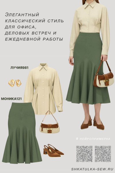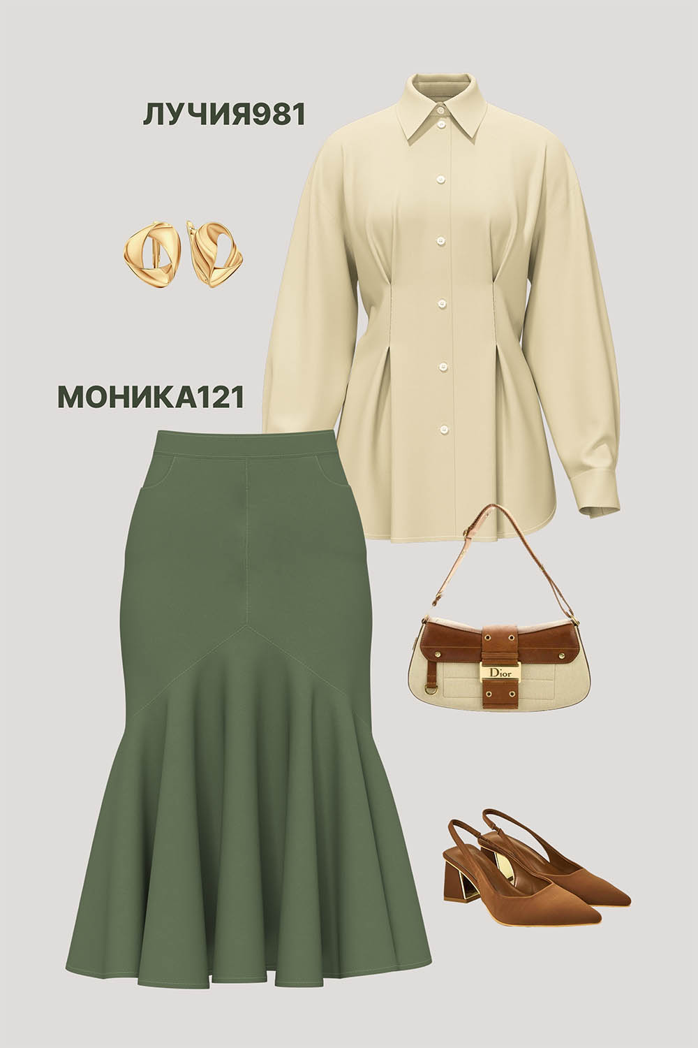 Застёжка юбки — молния в среднем шве заднего полотнища и обмётанная петля и пуговица на поясе. Выкройка юбки предусмотрена в двух длинах — макси (до щиколотки) и миди (ниже колена).