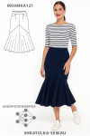 4Выкройка женской юбки силуэта годе. Переднее полотнище юбки — с талиевыми вытачками и средним швом, с притачной расклешённой нижней частью, с боковыми карманами с подрезным бочком. Заднее полотнище юбки — с талиевыми вытачками и средним швом, с притачной расклешённой нижней частью. Верхний срез юбки обработан притачным поясом.