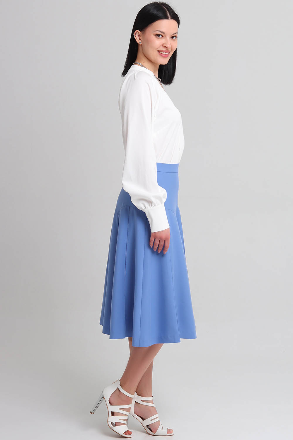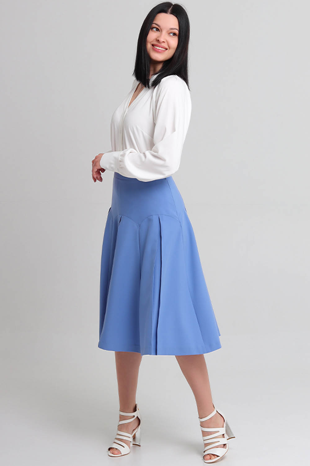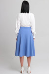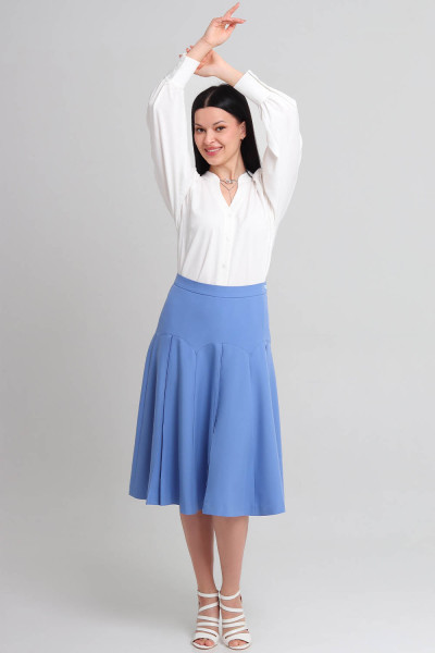 4Выкройка женской юбки умеренного объёма, А-силуэта. Переднее и заднее полотнища юбки - с фигурными кокетками и тремя стачанными между собой клиньями, на каждом из которых по центру предусмотрена отстроченная в край встречная складка. Линия талии в юбке находится на естественном месте. Верхний срез юбки обработан притачным поясом. Застёжка - потайная молния, расположена в левом боковом шве юбки, а также обмётанная петля и пуговица на поясе. Длина юбки - ниже колена.
