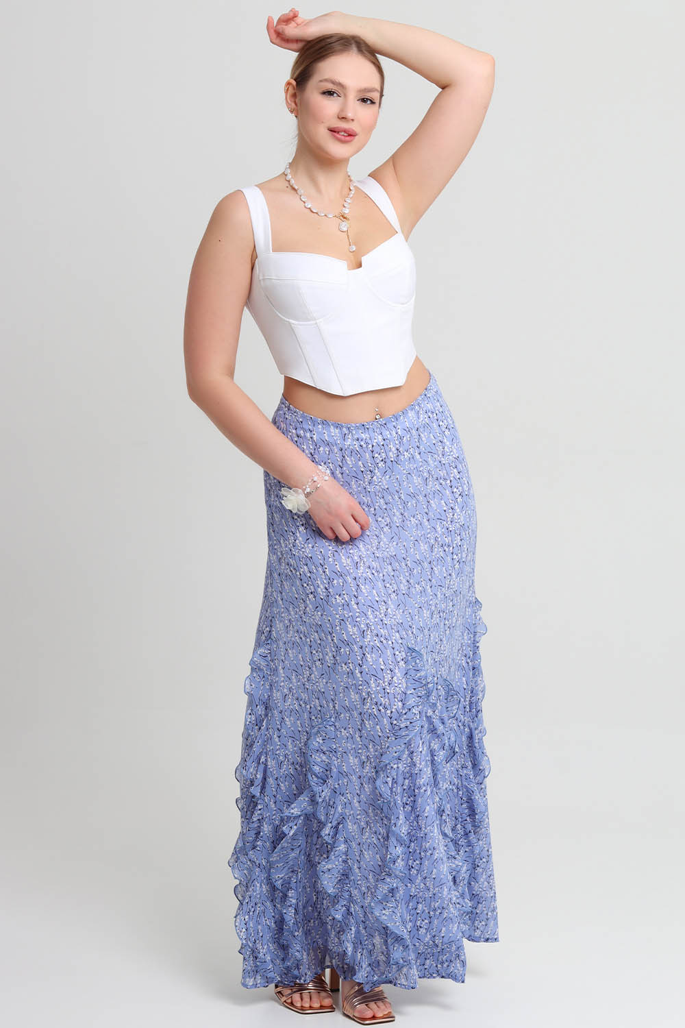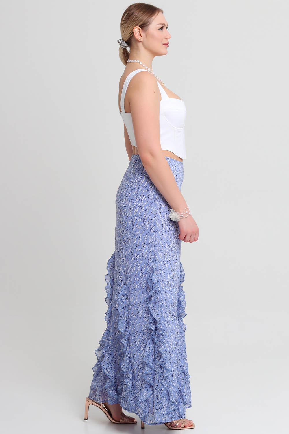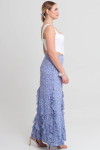 Верхний срез юбки обработан подкройной обтачкой и подкладкой. Застёжка - потайная молния - расположена в левом боковом шве юбки. Длина юбки - до щиколотки.