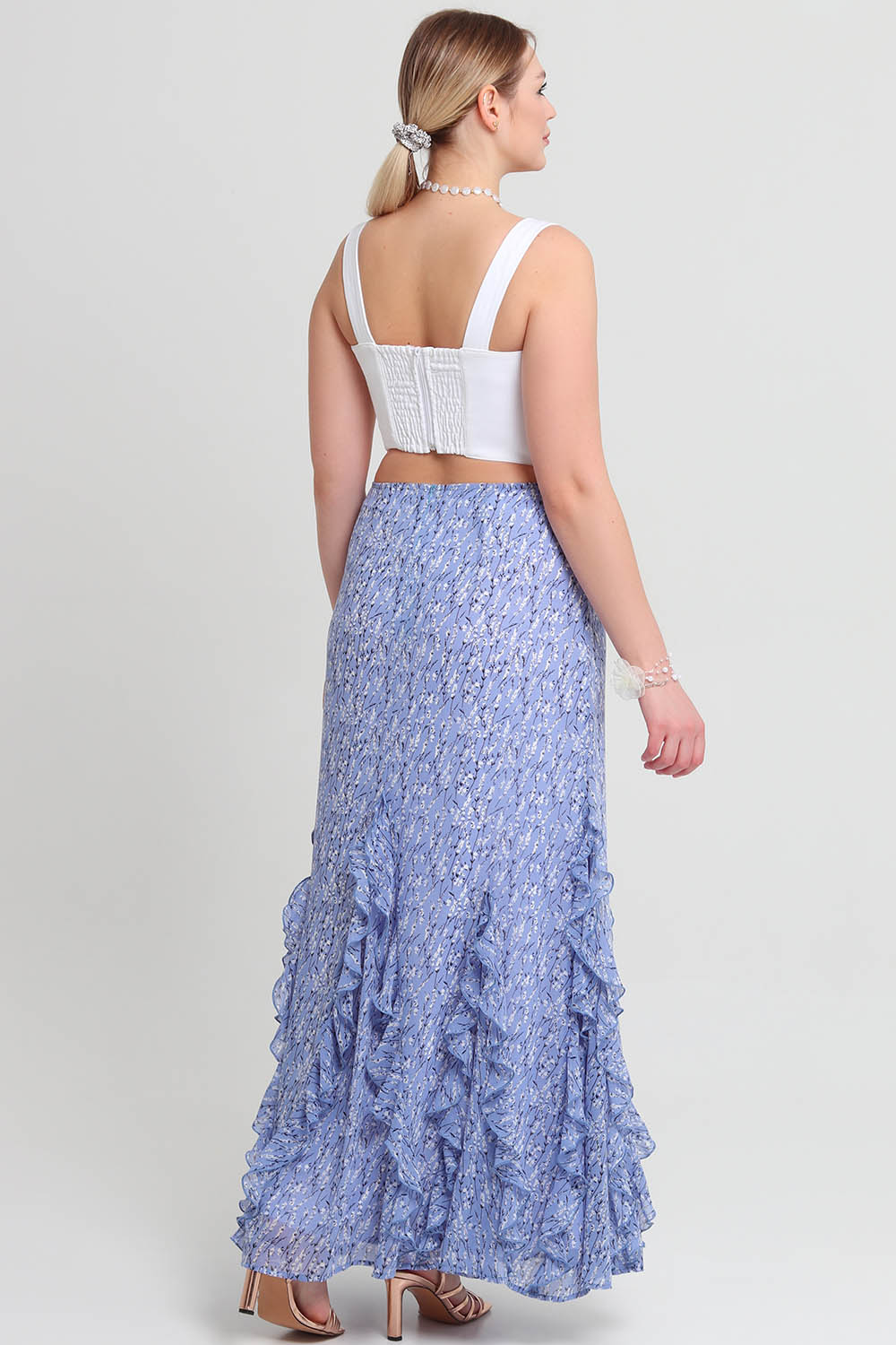 4Выкройка женской юбки умеренного объёма, полуприлегающего силуэта, немного расширенной книзу от линии бёдер, выполненной на подкладке. Переднее полотнище юбки - с тремя втачными клиньями по низу. Каждый шов втачивания клина декорирован втачными воланами. Заднее полотнище юбки - с талиевыми вытачками и средним швом. По низу заднего полотнища предусмотрены три втачных клина с воланами, один из которых обработан в среднем шве заднего полотнища. По боковым швам юбки также предусмотрены по одному втачному клину с воланами.