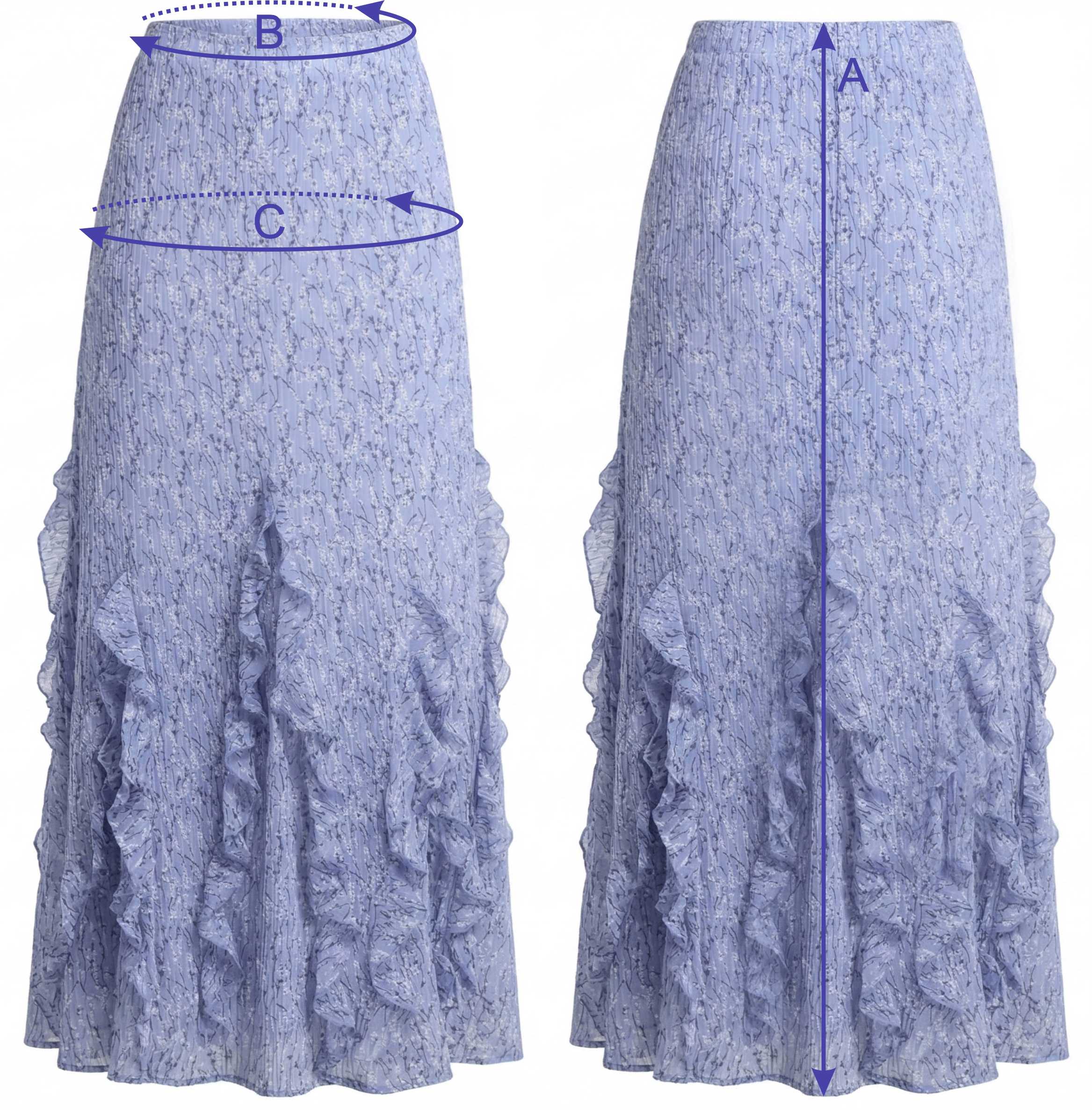 B - ширина на уровне талии в полном обхвате