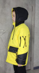 На полочке накладные карманы-полупортфели с клапанами, спинка - без особенностей. Рукава резные из трех частей с накладным карманом на молнии на одном из рукавов. С внутренней стороны рукавов предусмотрены ветрозащитные манжеты. Воротник-стойка, капюшон двухшовный, не доходит до линии середины переда. На изнанке куртки предусмотремы 2 вида внутренних карманов, по низу куртки присутствует ветрозащитная юбка на резинке и застежке.